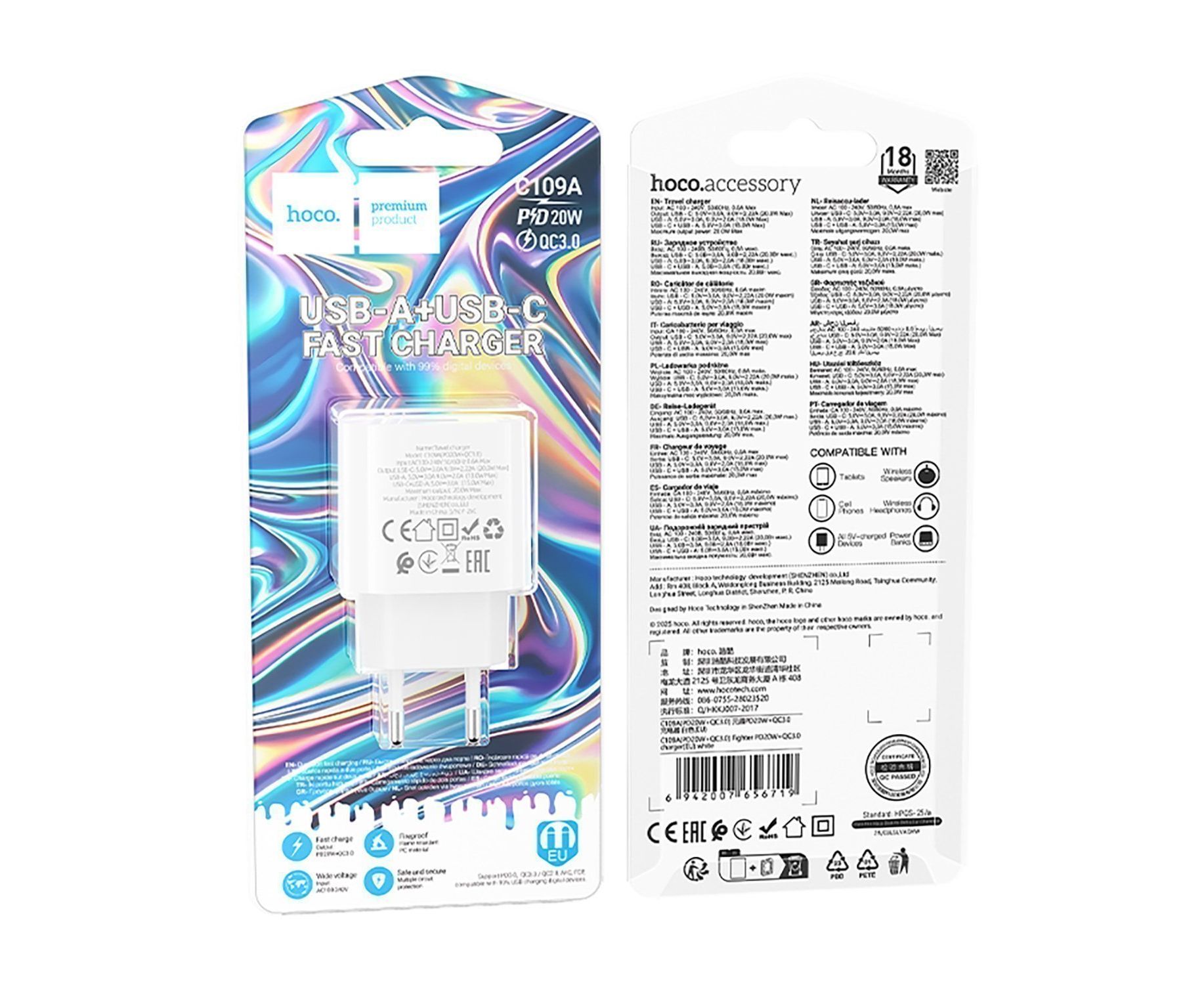 Адаптер Сетевой Hoco C109A PD+QC3.0 USB/Type-C 3A/20W (white) (242924)