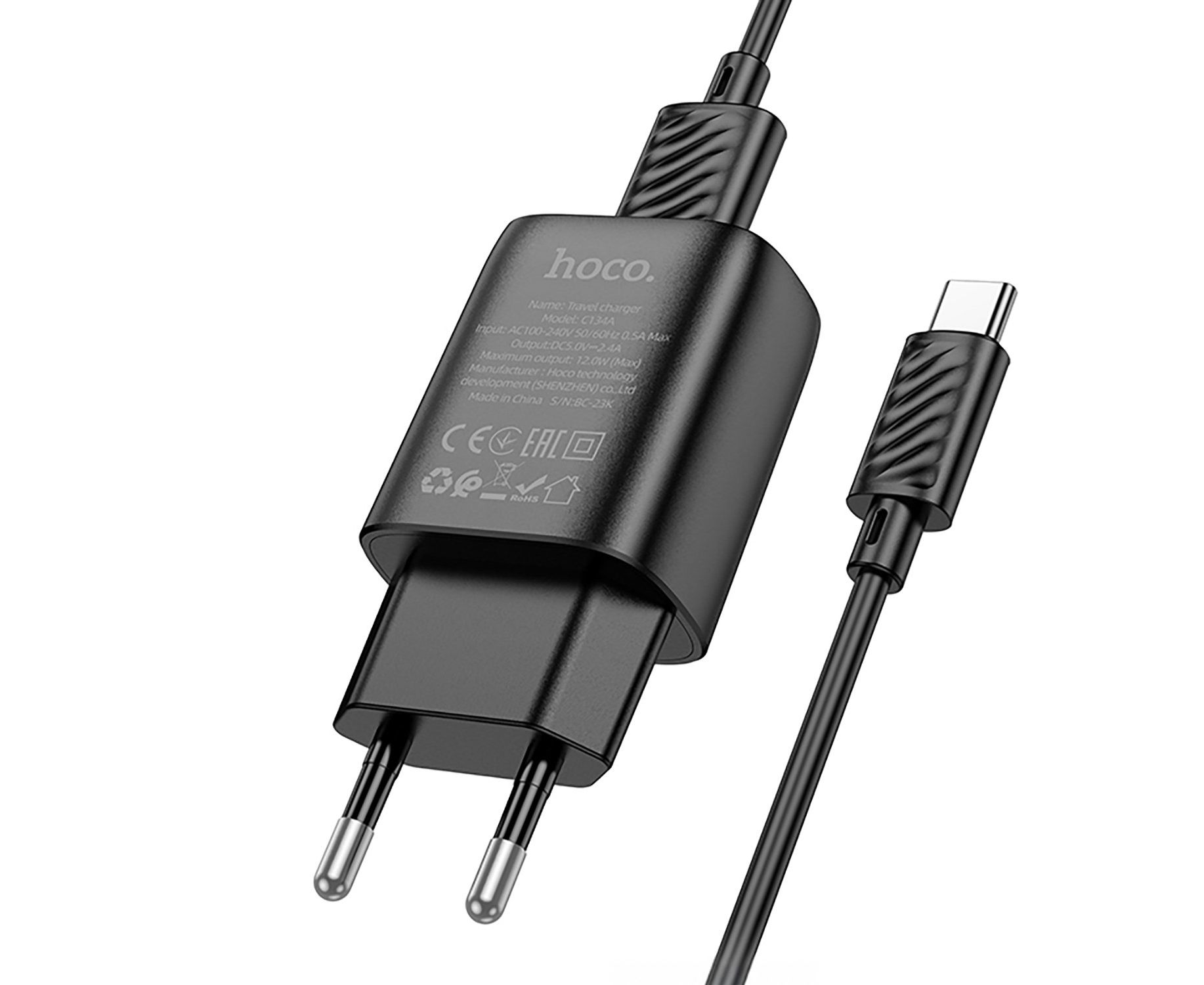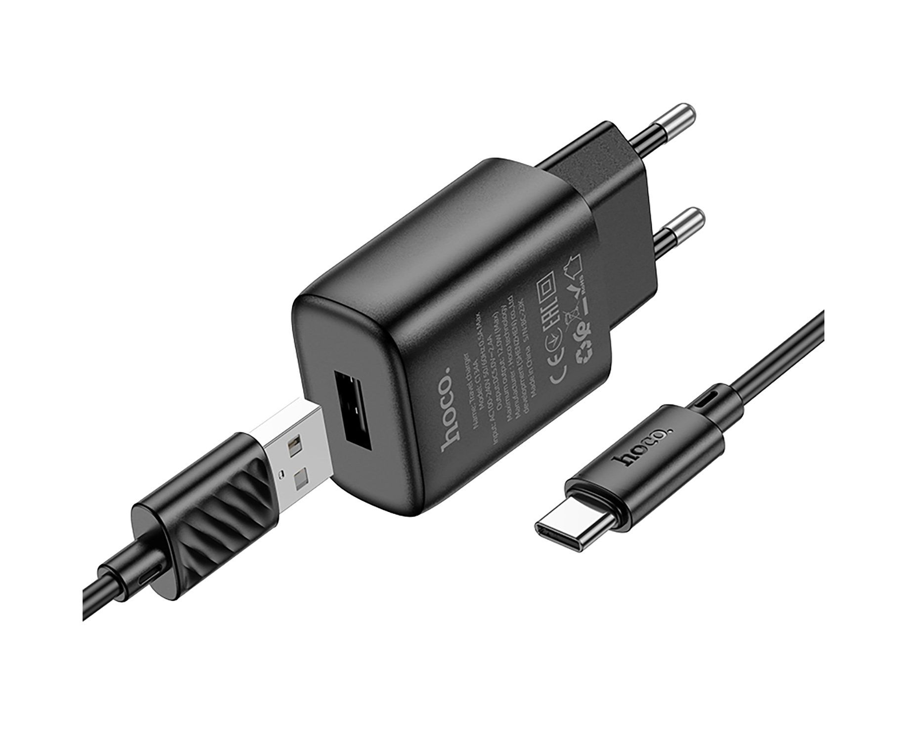 Адаптер Сетевой с кабелем Hoco C134A Solid USB 2,4A/12W (USB/Type-C) (black) (240263)