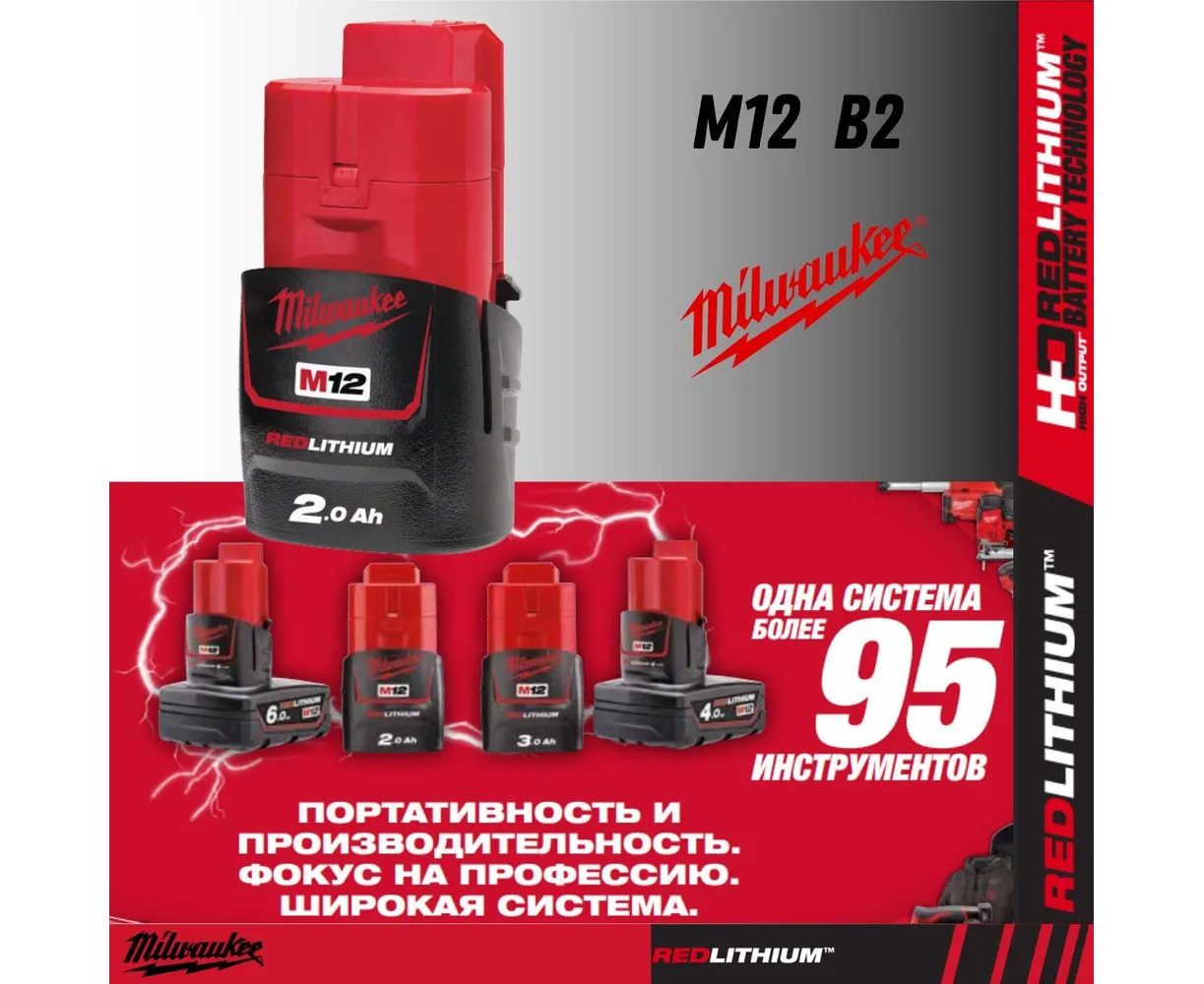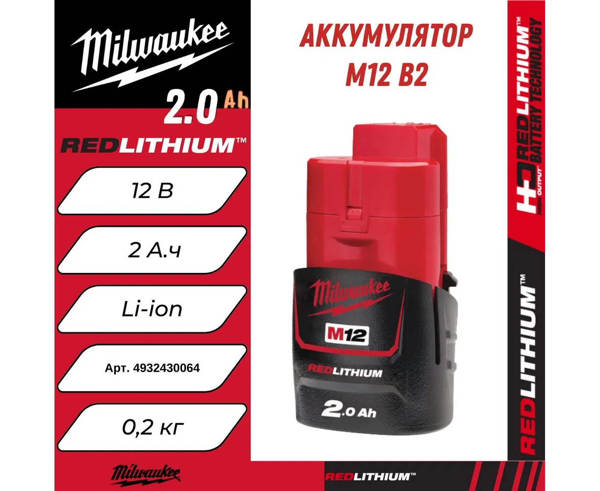 Аккумулятор M12 B2 Milwaukee 4932430064 предназначен для аккумуляторного инструмента Milwaukee. Li-Ion аккумулятор характеризуется отсутствием "эффекта памяти". Заряжать его можно при любой степени разрядки. Аккумулятор имеет новую электронику Milwaukee® REDLINK™, которая отличается защитой от перегрузок, системой контроля температуры и контроля каждой ячейки аккумулятора. Все это продлевает срок службы аккумулятора и оптимизирует его работу. Новые аккумуляторы Milwaukee на 20% мощнее и в 2 раза дольше держат заряд (в сравнении с предыдущими версиями аккумуляторов Milwaukee). Необходимо иметь запасную аккумуляторную батарею, чтобы избежать простоя инструмента во время зарядки основной батареи.