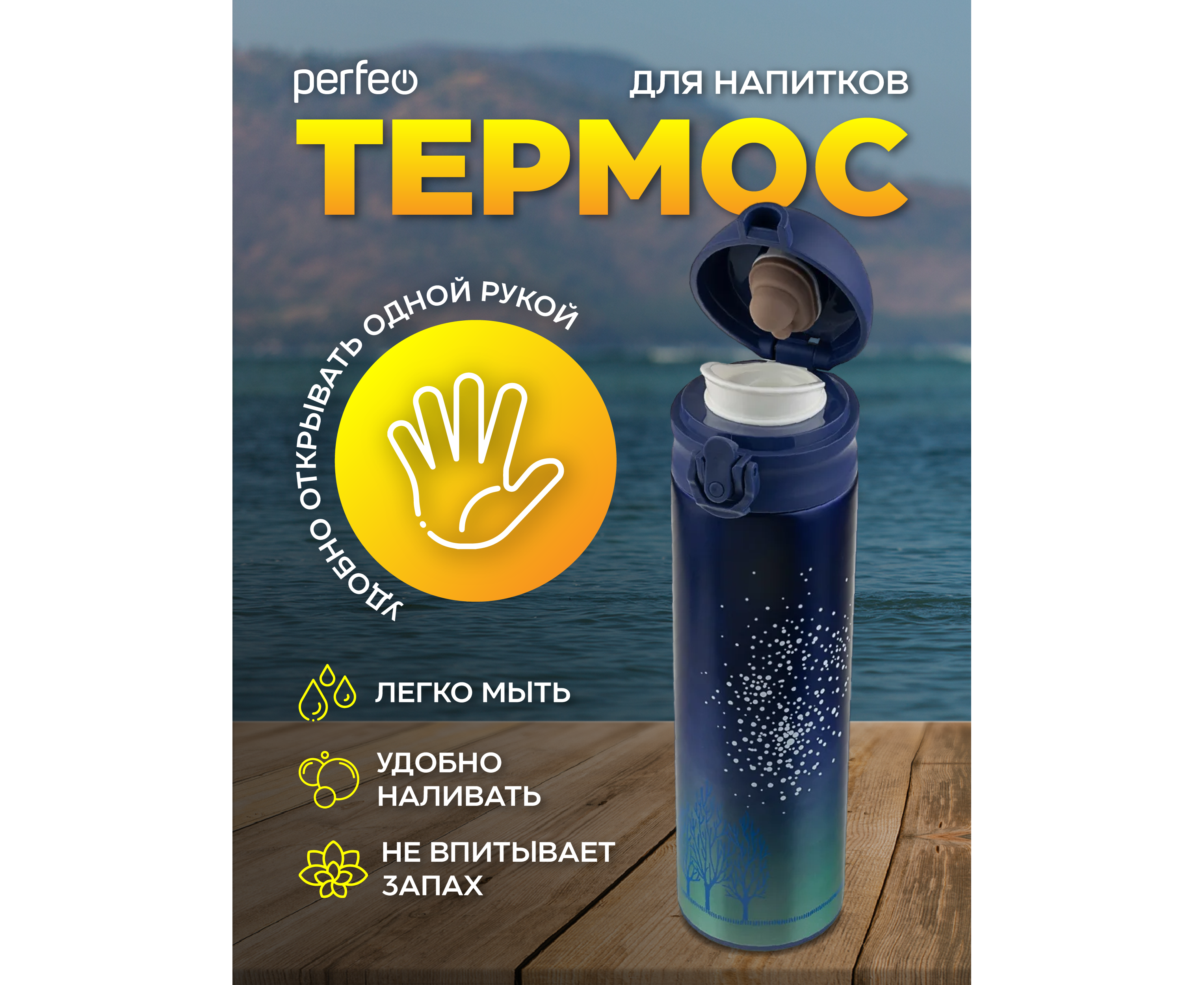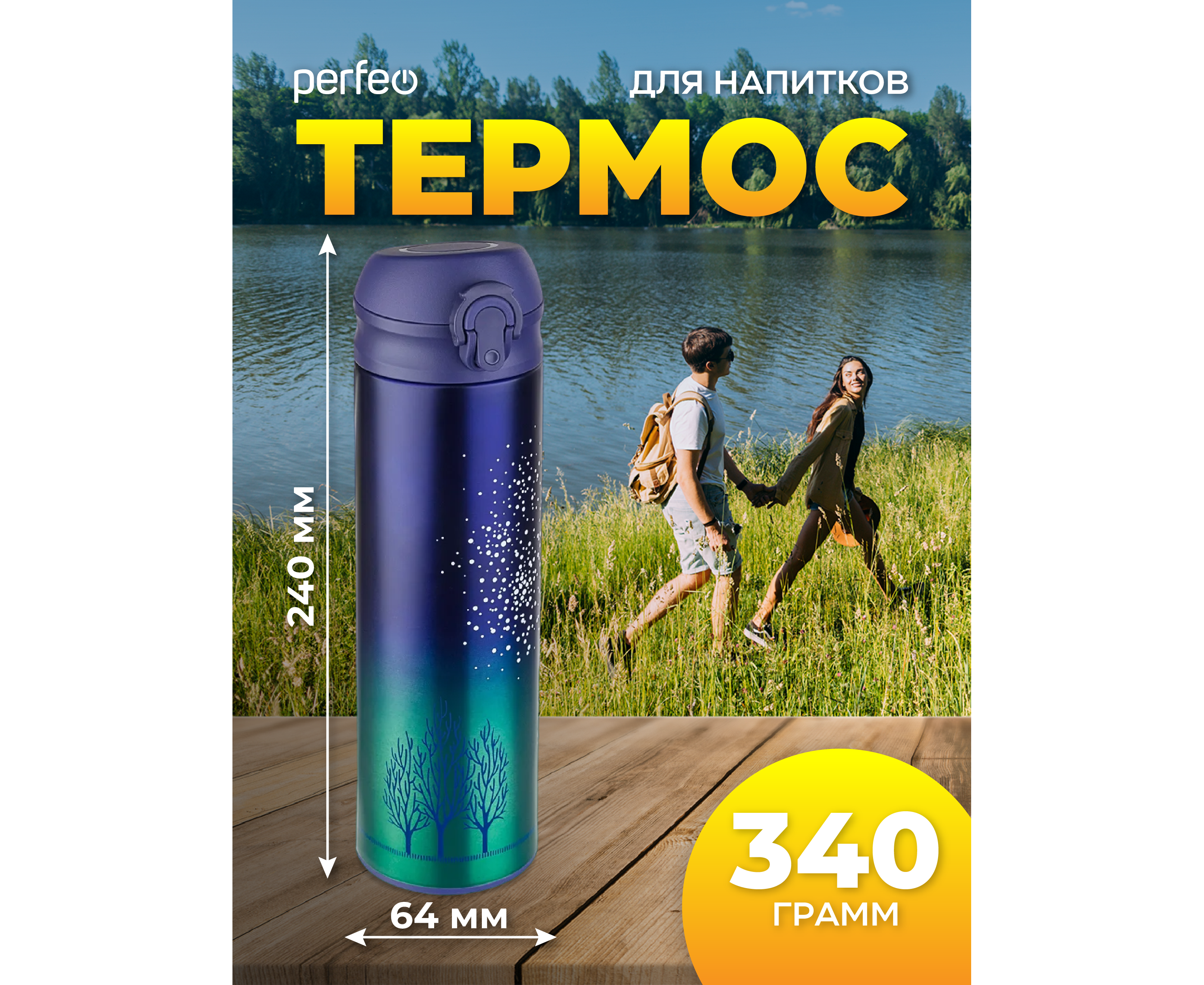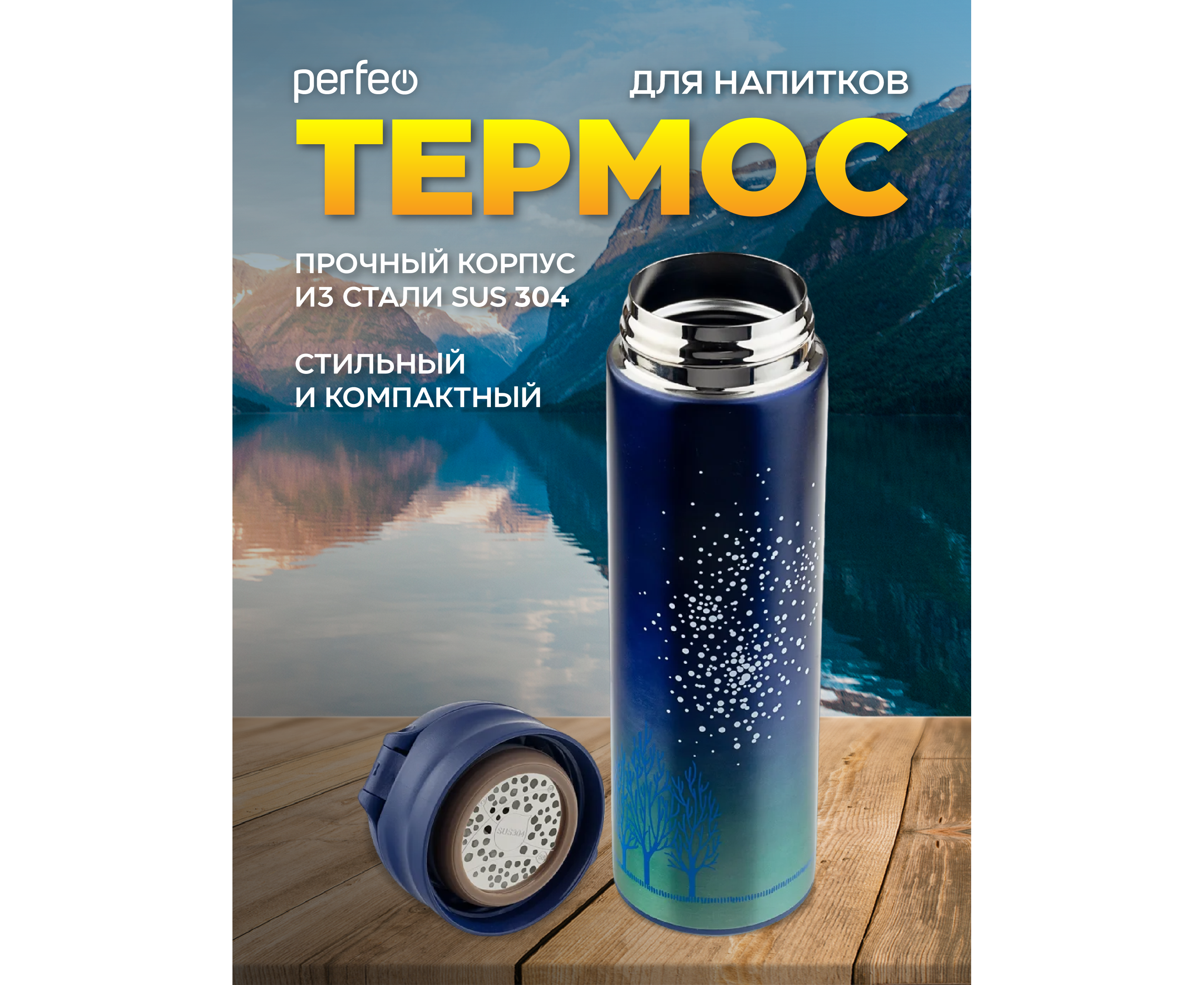 Термос для напитков PERFEO с крышкой-поилкой, ситечком, объем 0,5 л., звездное небо, (Арт. PF_C3714)