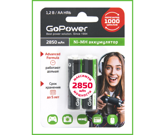 Ni-MH аккумулятор размера АА/НR6 емкостью 2850мАч. Если вы часто покупаете батарейки, переходите на Ni-MH аккумуляторы GoPower! Ni-MH аккумуляторы GoPower перезаряжаемы до 1000 раз и заменят батарейки во всех современных устройствах, они сэкономят деньги и не навредят окружающей среде. Производятся по улучшенной технологии с использованием премиальных компонентов, что гарантирует продолжительный срок службы 1000 циклов и сниженный саморазряд.