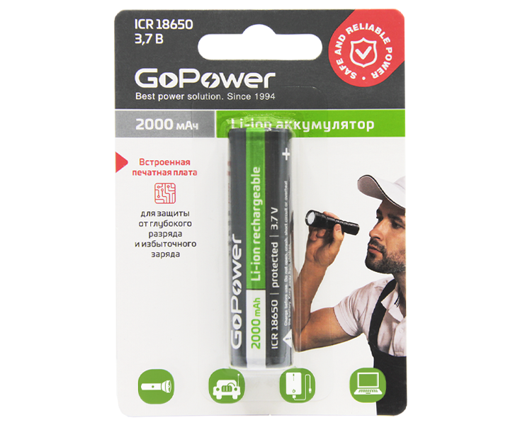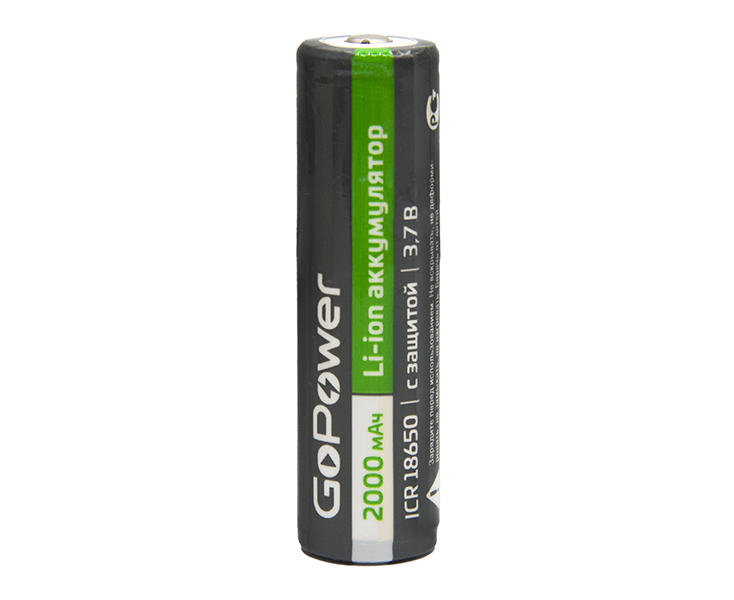 Литий-ионный (Li-ion) аккумулятор GoPower размера 18650. Зарядите перед использованием.