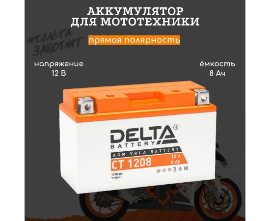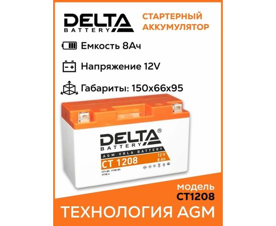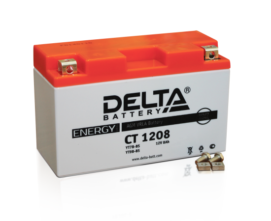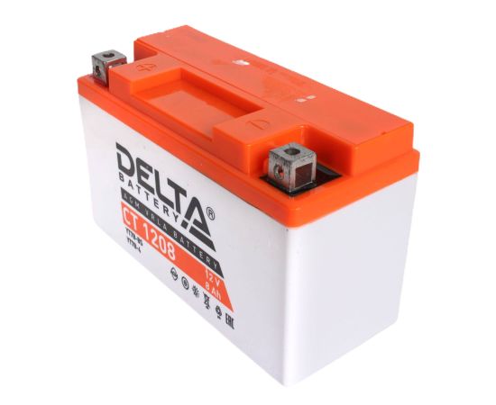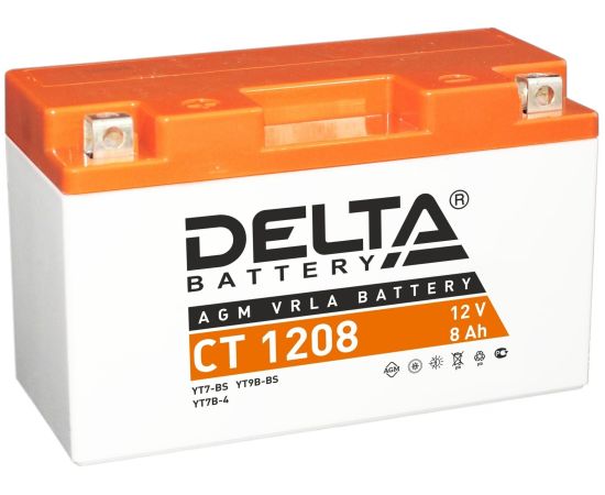 Аккумуляторная батарея Delta CT 1208 соответствует следующему коду YUASA: YT7B-BS, YT7B-4, YT9B-BS. Разработана специально для пуска двигателей мототехники. Изготовлена по технологии AGM (с микропористым заполнителем, пропитанным электролитом) из негорючего ABS пластика. Высокая стартовая мощность и повышенная энергоотдача. Адаптирован к российским условиям эксплуатации.