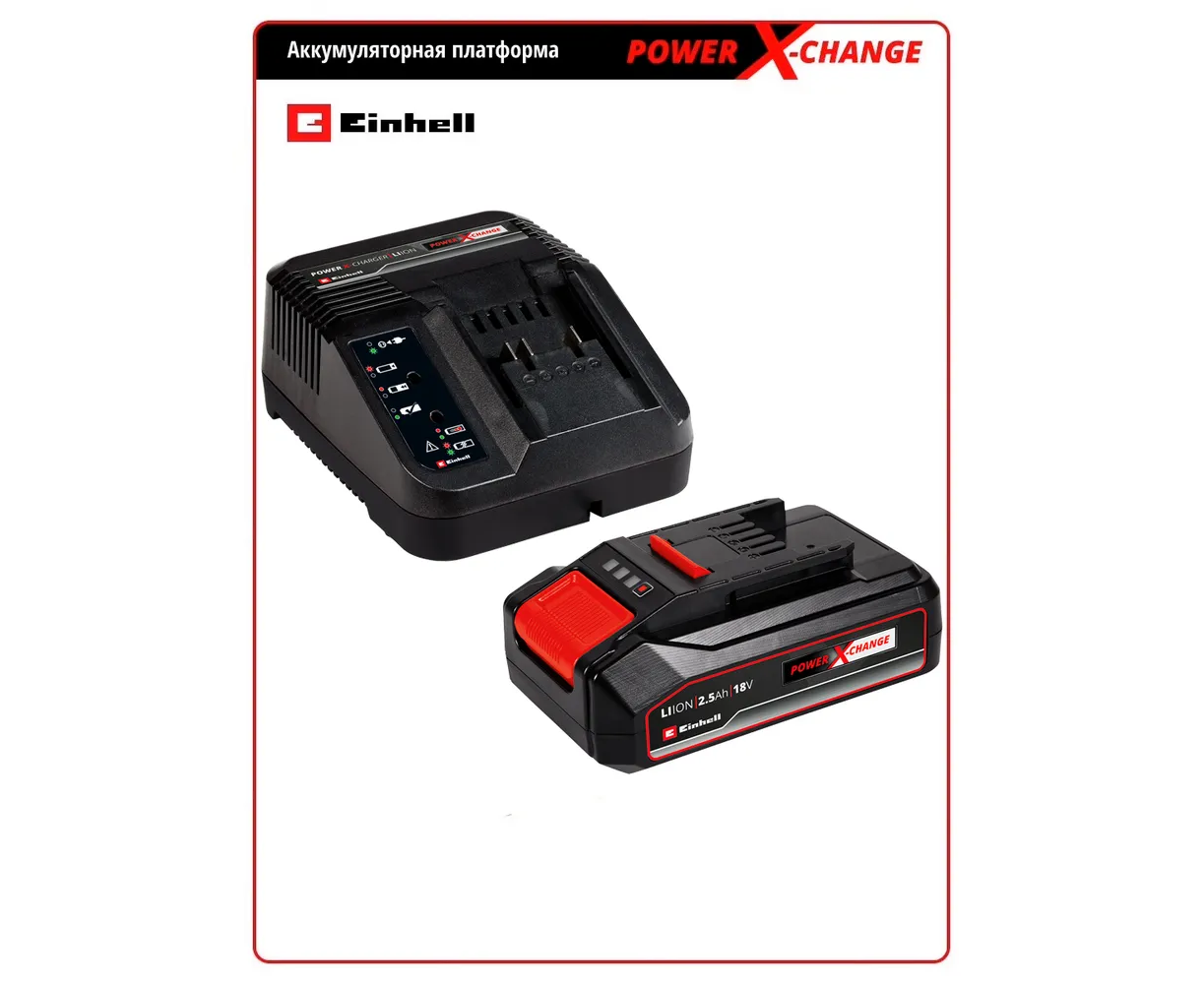 Комплект аккумулятор PXC (18В; 2.5 Ач; Li-Ion) и зарядное устройство Einhell 4512097 максимально безопасны, имеют длительный срок службы и оптимальную производительность. Подходит для зарядки аккумуляторов линейки Power X-Change.
