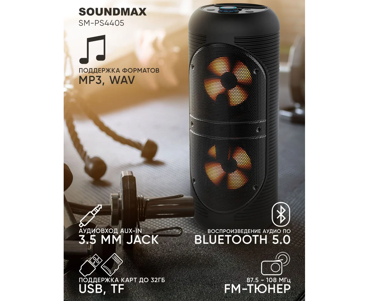 Портативная аудиосистема SM-PS4405 обладает приятным дизайном корпуса, удобна в переноске за счет встроенной ручки. Общая выходная мощность колонки — 50 Вт, что для мобильного решения внушительный показатель.