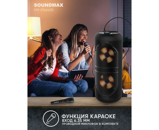 Приятной новостью для любителей караоке будет то, что колонка SM-PS4405 комплектуется проводным микрофоном, теперь у вас будет все, чтобы устроить спонтанную зажигательную вечеринку!