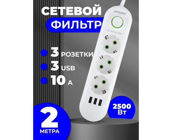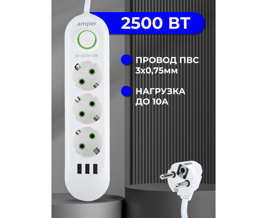 Сетевой удлинитель Amper , 2,0м, 3 розетки, 3*0,75мм, 10А, 2500 Вт, 3usb, белый