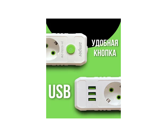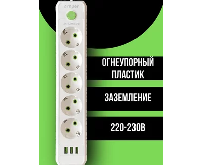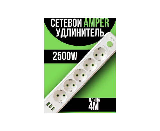 Сетевой удлинитель Amper , 4,0м, 5 розеток, 10А, 2500 Вт, 3usb, белый