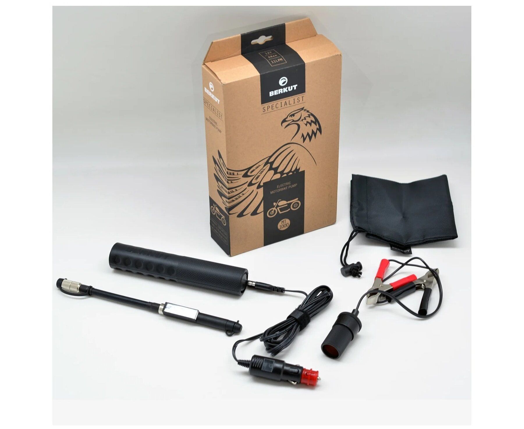 максимальный ток потребления — 6 А; мощность потребления — 70 Вт; температурный диапазон — от -20°C до + 45°C; погрешность манометра — ± 0,3 бар (± 5 psi); длина шланга — 250 мм; длина кабеля питания — 2,6 м; вес (устройства/комплекта) — 0.26 кг/ 0.56 кг; Комплектация: BERKUT MT-1000 — электрический насос для мототехники, шланг-удлинитель с манометром и наконечником-адаптером, кабель питания со штекером 12V, адаптер для подключения к клеммам АКБ, сумка-чехол для хранения и переноски, руководство по эксплуатации,