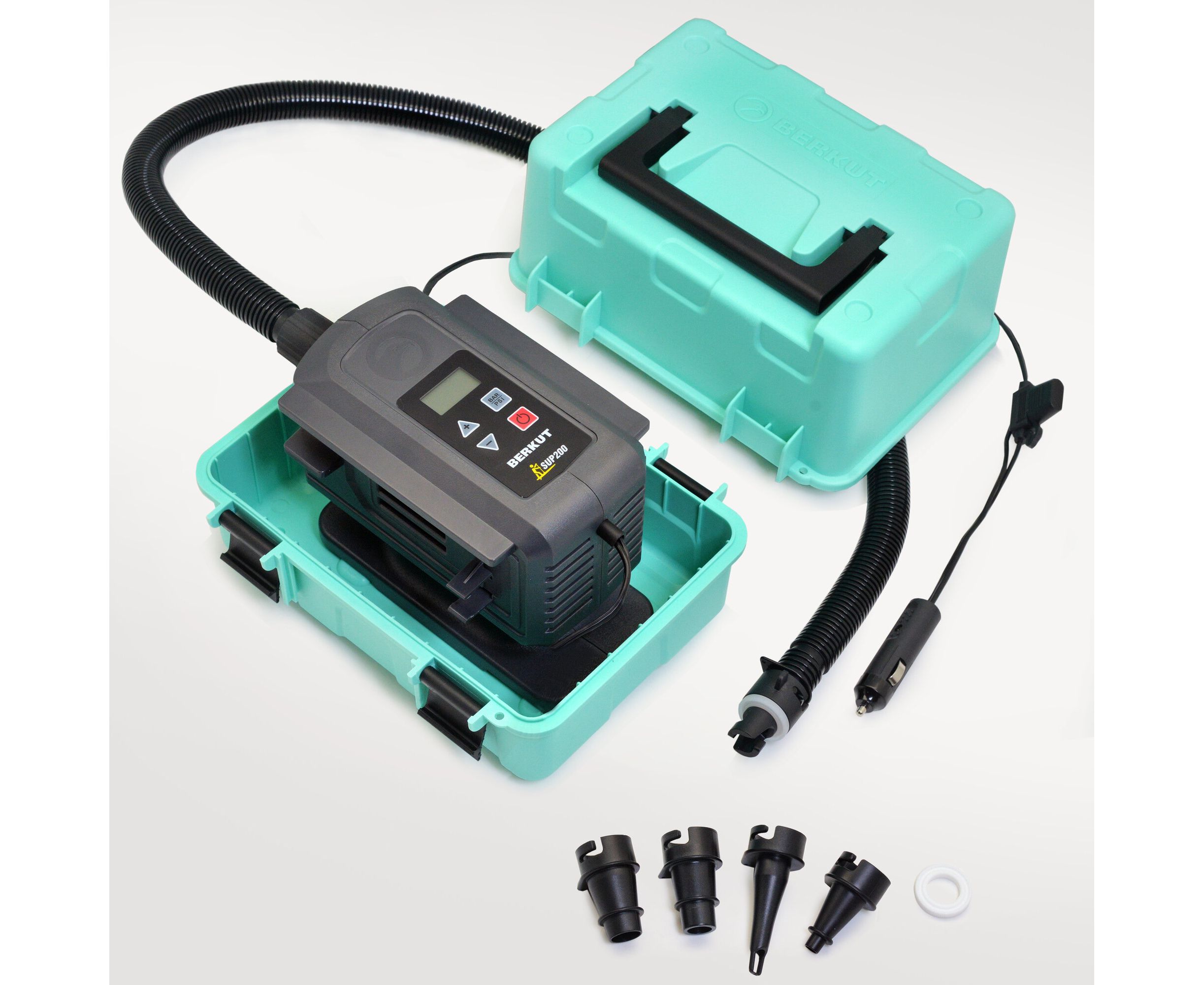 BERKUT SUP-200 предназначен для накачивания сапбордов, надувных лодок, каяков, байдарок, палаток, матрасов и т.п. Высокоэффективный двухпоршневой компрессор SUP-200 обеспечивает производительность до 180 л/мин (средняя скорость накачки Сапборда — 8-9 минут). Максимальное рабочее давление 20PSI (1,38bar) позволяет накачивать жесткие спортивные сапборды профессиональной серии. Удобное цифровое управление и манометр с функцией АВТОСТОП позволяет точно накачивать оборудование до выбранного давления. Эргономичный дизайн и интеграция в ударопрочный кейс со специальной ручкой для переноски позволяет не тратить длительное время на разворачивание системы. Набор различных насадок 5 шт. для накачивания различных надувных изделий (Сапы, лодки, каяки, палатки, матрасы и т.п.). Компрессор работает от бортовой розетки 12V и потребляет не более 12-13A (Допускается подключение к ПЗУ BERKUT серии JSL и PSL)