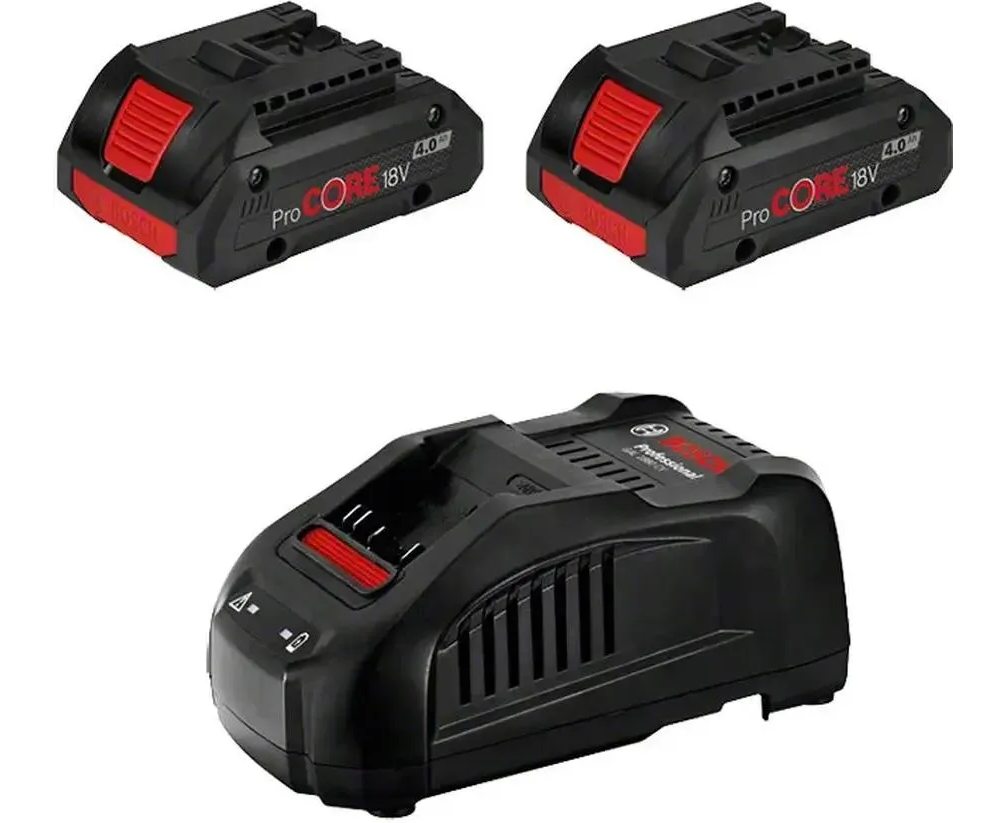 Набор аккумуляторов Li-Ion ProCORE 4 Ач, 18В + ЗУ GAL 1880 CV Professional Bosch 1600A016GF позволяет производить работы в сервисах и на стройках без простоя.