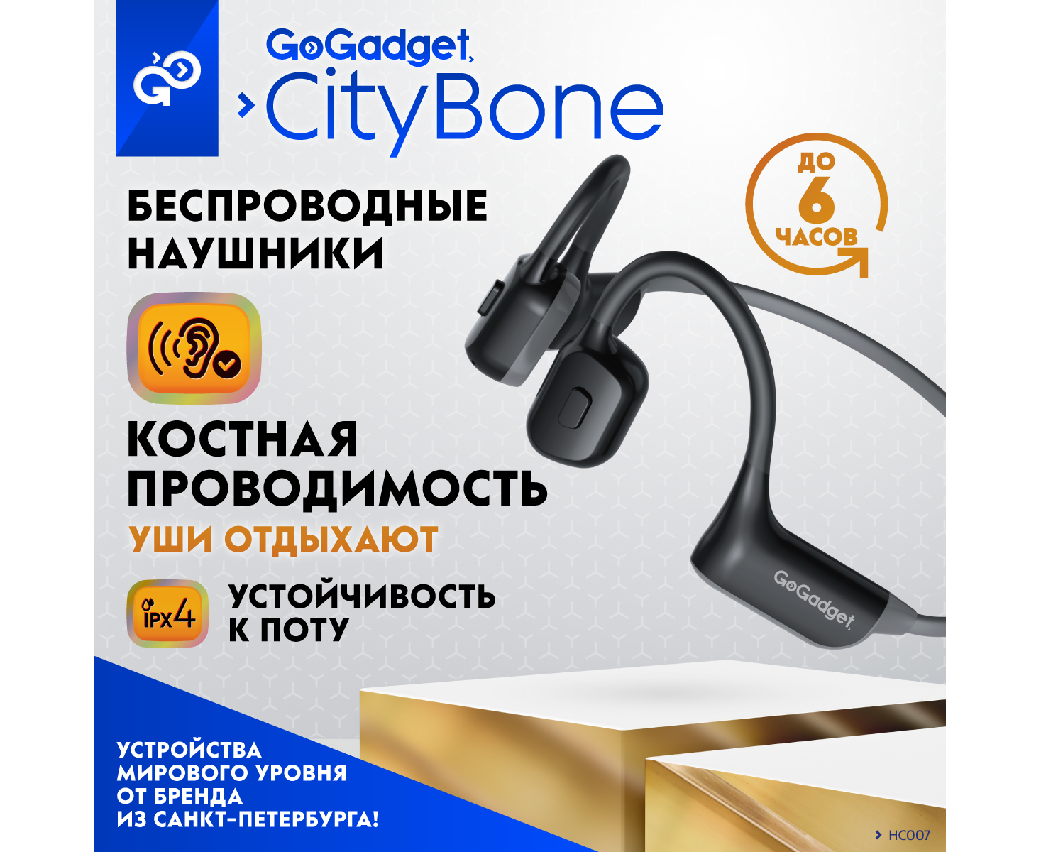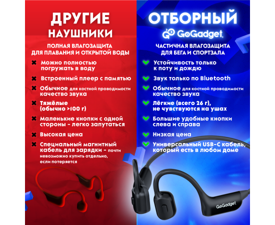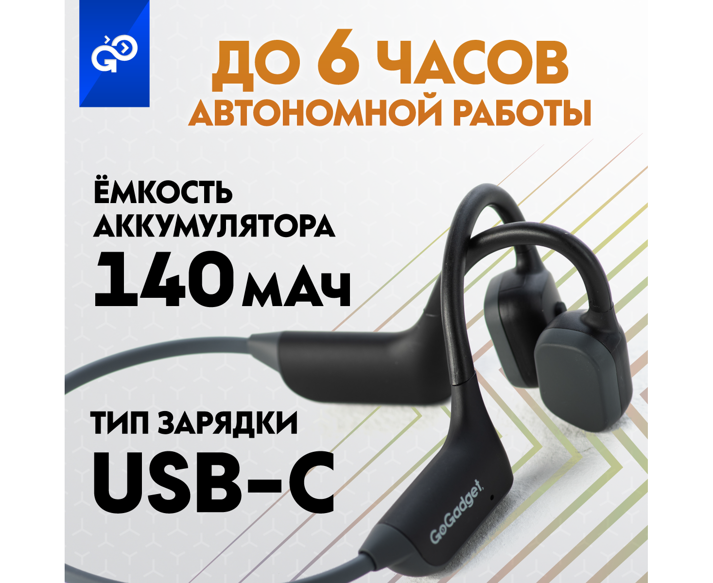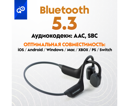 Беспроводные наушники GoGadget CityBone, зашейная дуга, костная проводимость, 1 микрофон, 140 мАч, до 7 часов, ЧЕРНЫЙ