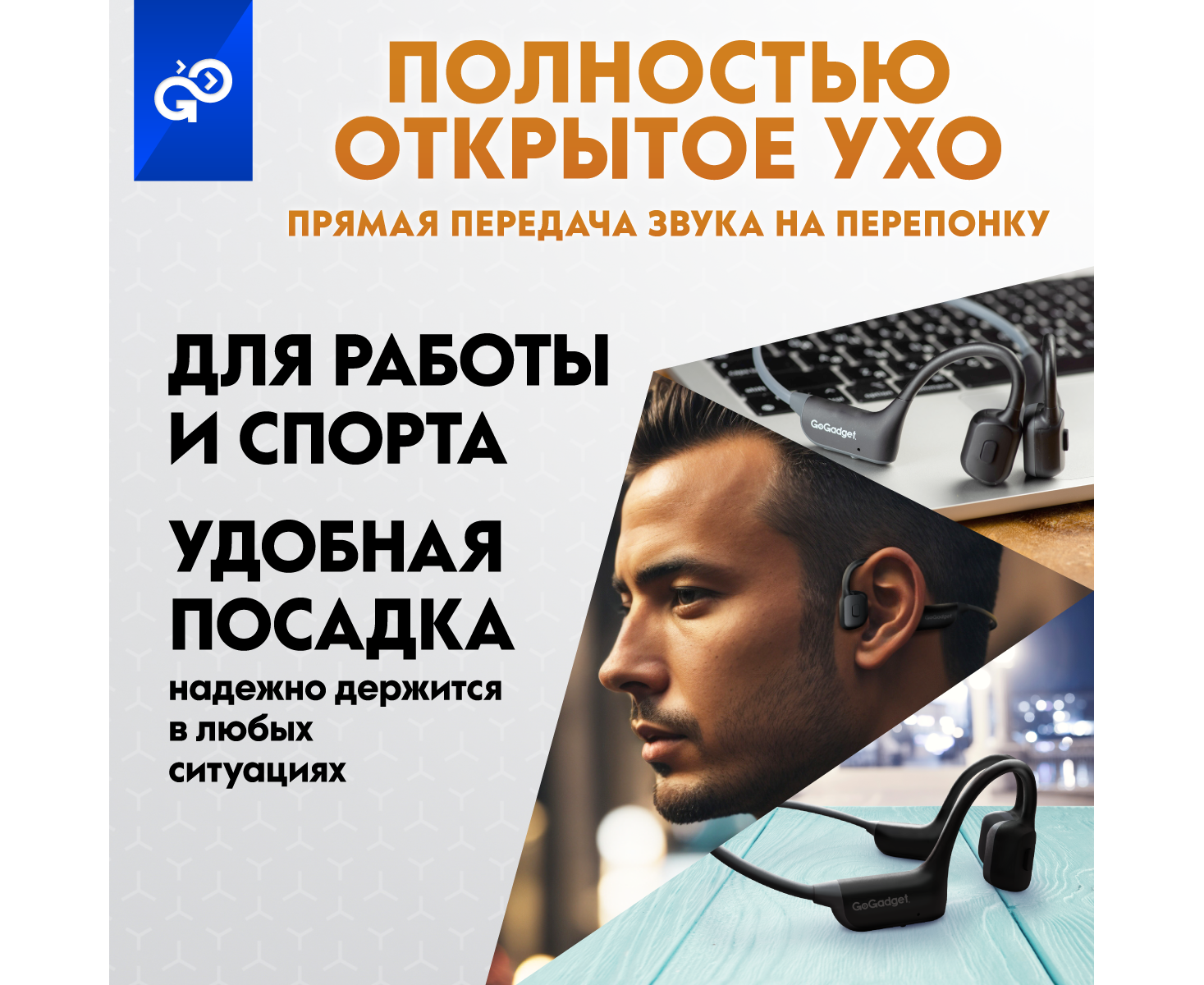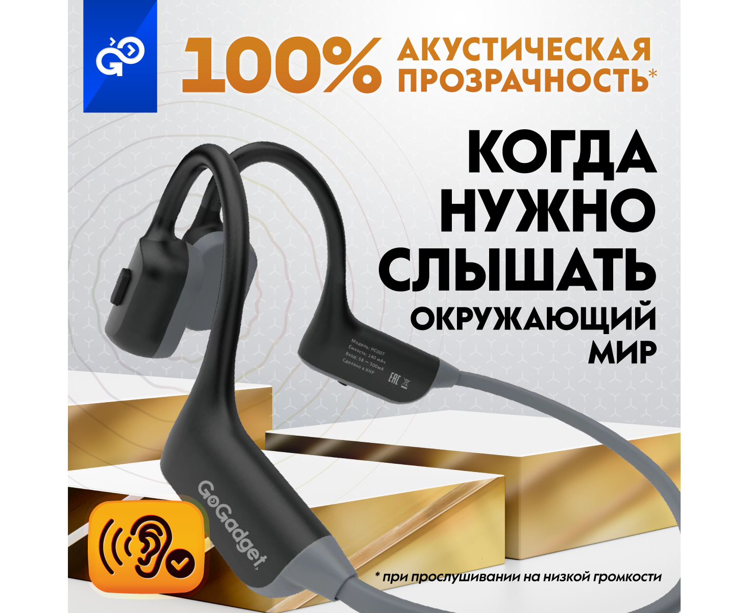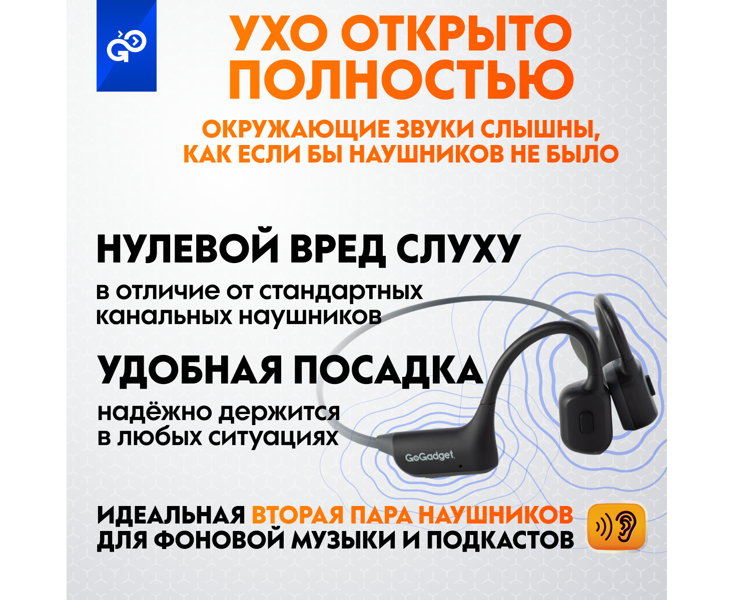 Беспроводные наушники GoGadget CityBone, зашейная дуга, костная проводимость, 1 микрофон, 140 мАч, до 7 часов, ЧЕРНЫЙ