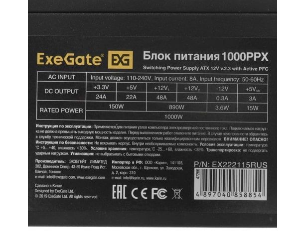Блок питания Exegate 1000PPX EX222115RUS 1000WRTL, ATX, black, active PFC, 14cm, 24p+2*(4+4)p,PCI-E,5SATA