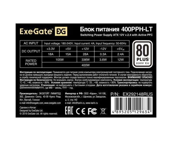Блок питания ExeGate 400PPH-LT EX292148RUS 400W ATX, APFC, КПД 82% (80 PLUS), 12cm fan, 24pin, (4+4)pin, PCIe, 5xSATA, 3xIDE, black