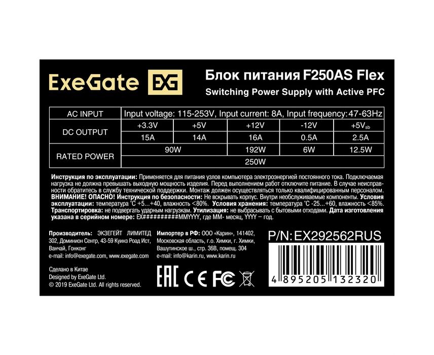 Блок питания ExeGate F250AS EX292562RUS 250W (Flex ATX, for ITX case, APFC, КПД 80проц. (80 Plus), 4cm fan, 24pin, (4+4)pin, PCI-E, 3xSATA, 2xIDE)