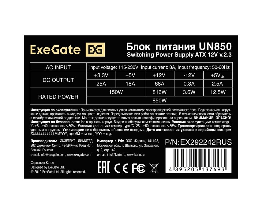 Блок питания ExeGate UN850 (EX292242RUS) 850W (ATX, 12cm fan, 24pin, 2x(4+4)pin, PCI-E, 3xSATA, 2xIDE)
