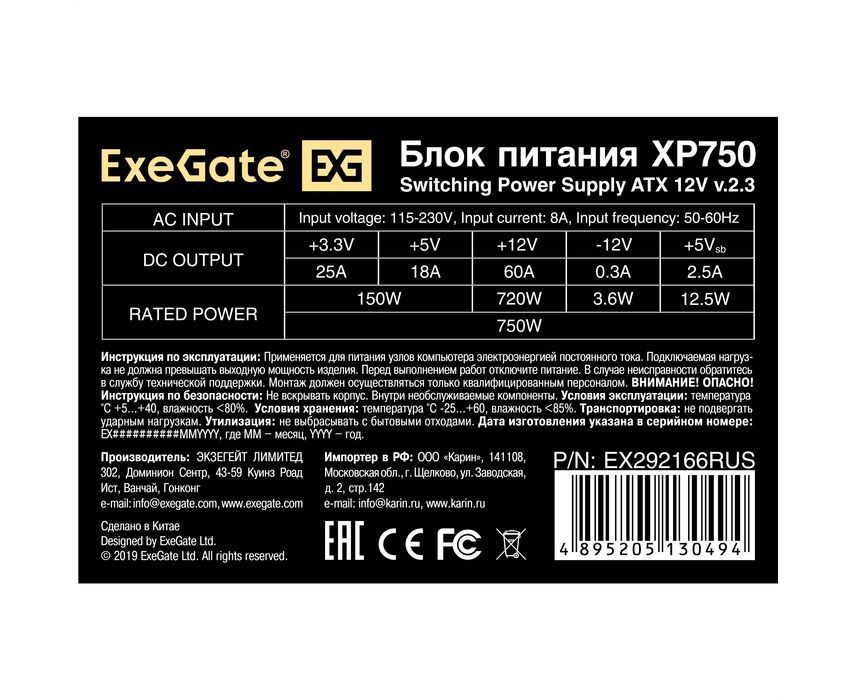 Блок питания ExeGate XP750 EX292166RUS 750W (ATX, 12cm fan, 24pin, 4+4pin, PCIe, 3xSATA, 2xIDE, FDD, black)