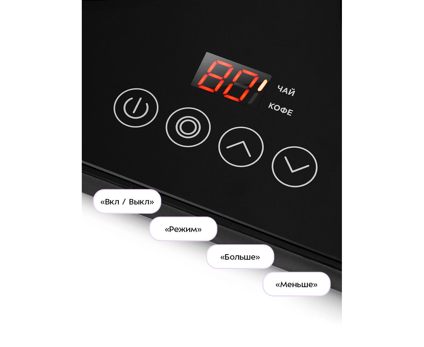 Управление платформой осуществляется при помощи сенсорных кнопок на корпусе. Во время работы платформы на дисплее отображается установленная температура нагрева. Кнопка «Режим» циклически переключает два режима работы платформы с подогревом: Чай и Кофе.