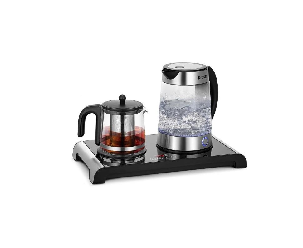 Чайный набор КТ-6743 состоит из чайника, заварочного чайника с фильтром и базы. Набор позволяет не только вскипятить воду, но и заварить чай или кофе, а также сохранить готовый напиток тёплым в течение 4 часов за счёт платформы с подогревом.