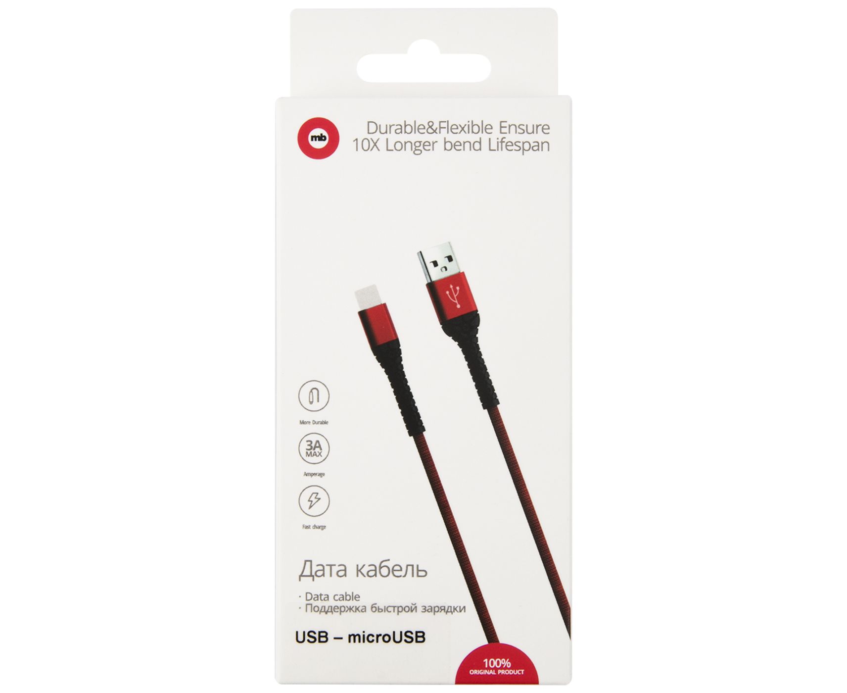 Дата-кабель mObility USB – microUSB, 3А, тканевая оплетка, красный