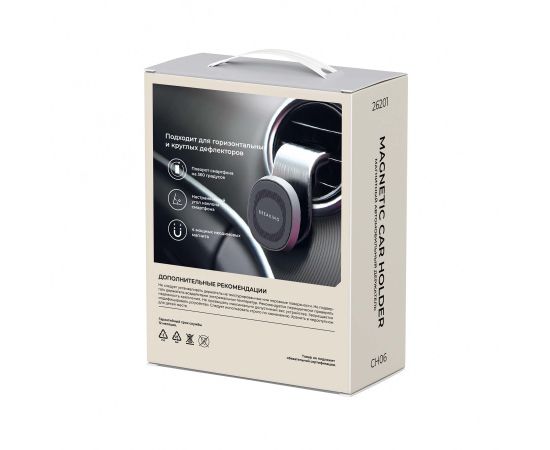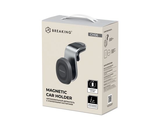 Магнитный автомобильный держатель BREAKING CH06 предназначен для фиксации смартфона в салоне автомобиля. Он крепится на вентиляционную решетку при помощи прищепки, не повреждает ее при повторной установке и снятии. Конструкция аксессуара допускает регулировку положения устройства при поддержке вращения на 360°. Установка смартфона на держатель осуществляется при помощи магнитного крепления. Для установки применяются металлические пластины, включенные в комплект.
