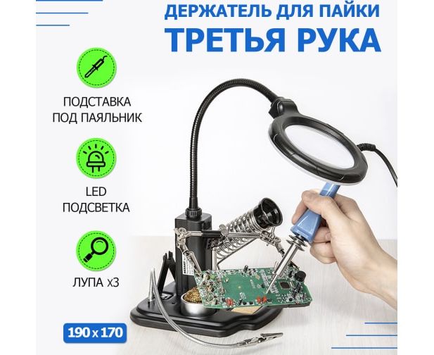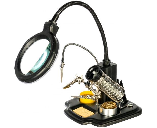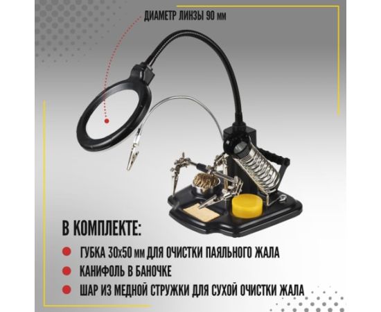 Держатель МАСТЕР ZD-10Y REXANT 12-0258 применяется при паяльно-сборочных работах. Предназначен для зажима мелких деталей в любом нужном положении. Оснастка состоит из основания (тяжелая подставка с нишами для предметов), двух подвижных зажимов на трубке типа "крокодил" с никелевым покрытием, зажима на длинной регулируемой стойке с никелевым покрытием, лупы с LED подсветкой (возможность регулировки положения), спиралевидной подставки под паяльник с никелевым покрытием, держателя припоя на катушках. Кроме этого, в комплекте поставляется: губка для очистки паяльного жала, канифоль в баночке и шар из медной стружки для сухой очистки жала. Подсветка интегрирована в держатель линзы, работает от четырех батареек типа AA. Оптическая сила линзы - 3 диоптрии. Диаметр линзы - 90 мм. Губка для очистки паяльного жала - 30х50 мм. Габаритные размеры - 190х170 мм. Цвет корпуса - черный.