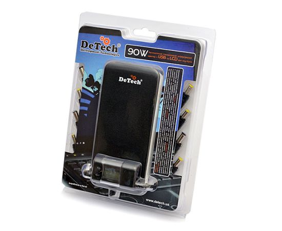 DeTech TJ-051 LCD Автоматический ультратонкий универсальный блок питания для ноутбуков с питанием 12-24 В — до 5 А, мощность 90 Вт. с USB выходом 5В 1А для зарядки различных устройств (МР3 плееров, моб. телефонов и др.). и LCD индикатором выходного напряжения.