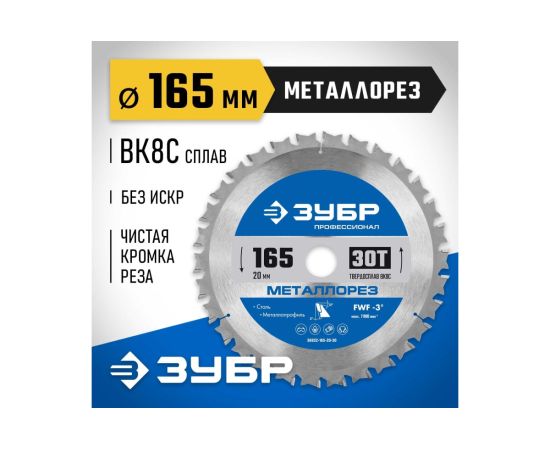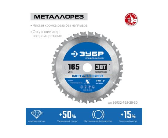 Технические характеристики пильного диска по металлу и металлопрофилю ЗУБР 36932-165-20-30