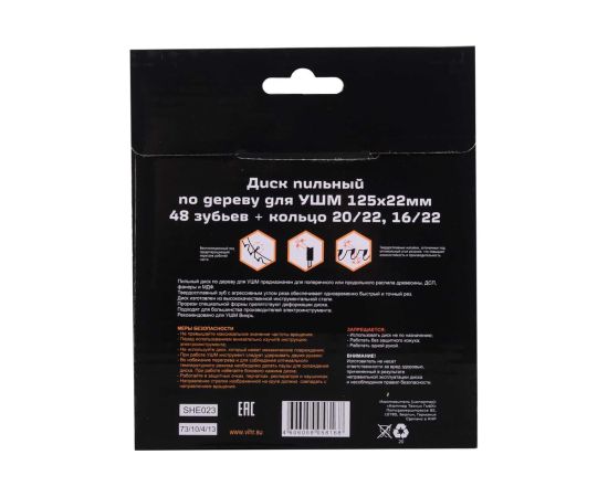 Диск пильный Вихрь 73/10/4/13 по дереву для УШМ 125х22мм, 48 зубьев+кольцо 20/22, 16/22