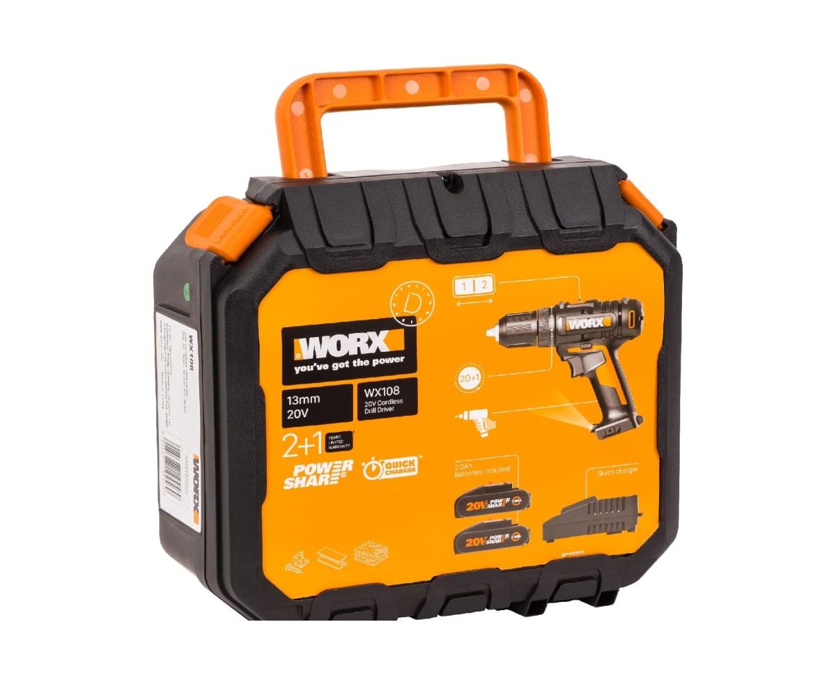 Дрель-шуруповерт WORX WX108 аккумуляторная, 50Нм, 20В, 2Ач x2, ЗУ 2А, кейс