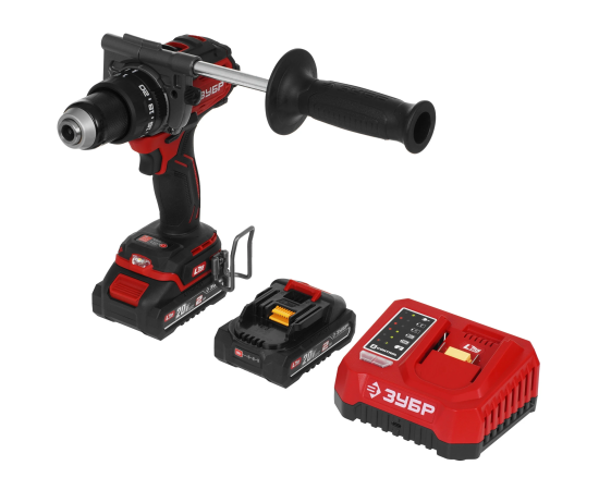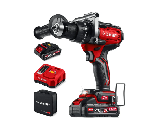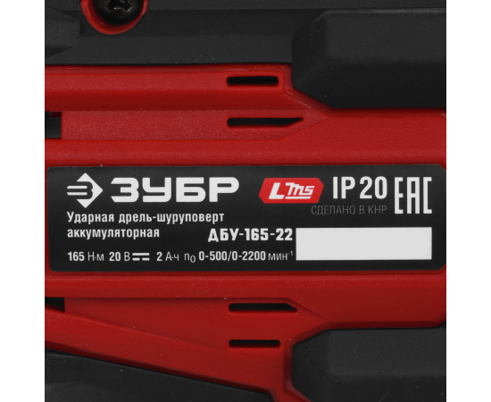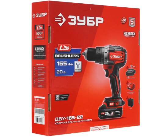 ЗУБР 20 В, 165 Н·м, 2 АКБ LMS (2 А·ч), бесщеточная ударная дрель-шуруповерт, сумка ДБУ-165-22 - бесщеточная ударная дрель-шуруповерт ЗУБР системы LMS с увеличенным крутящим моментом предназначена для быстрого заворачивания саморезов до 12 мм диаметром и сверления отверстий до 40 мм в дереве. Длительная работа от одного заряда обеспечивается эффективным двигателем BRUSHLESS. Расширенная функциональность за счет ударного режима работы. Комплектация с двумя аккумуляторами позволяет работать практически без остановки.
