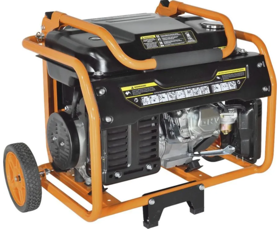 Бензиновый генератор предназначен для использования, как аварийный источник электроснабжения. Оснащен колесами и ручками для удобства перемещения. Автомат защиты. Устройство защиты двигателя при пониженном уровне масла.