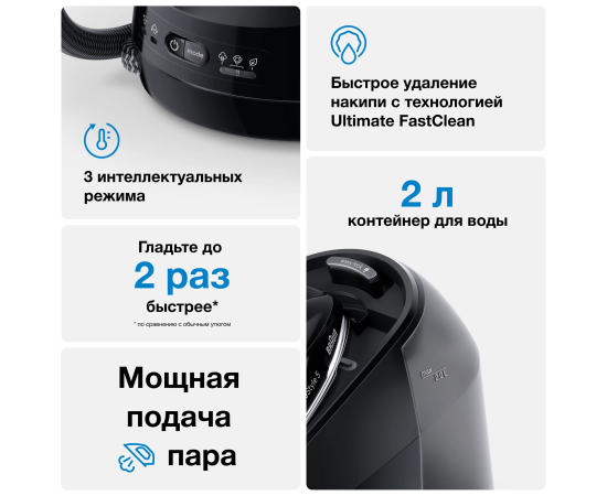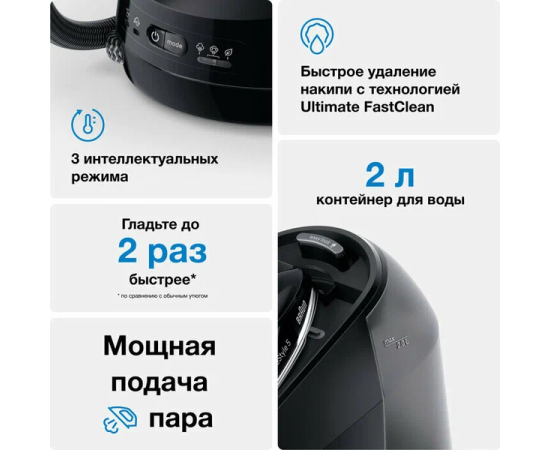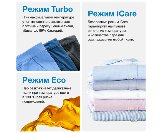 Этот эргономичный утюг может похвастаться уникальной открытой с обратной стороны и мягкой текстурированной ручкой, поэтому вы будете наслаждаться свободой движений во время длительных сеансов глажки. Режим Smart iCare защищает вашу одежду при безопасной температуре для всех видов тканей, которые можно гладить, — для интеллектуальной защиты текстиля.