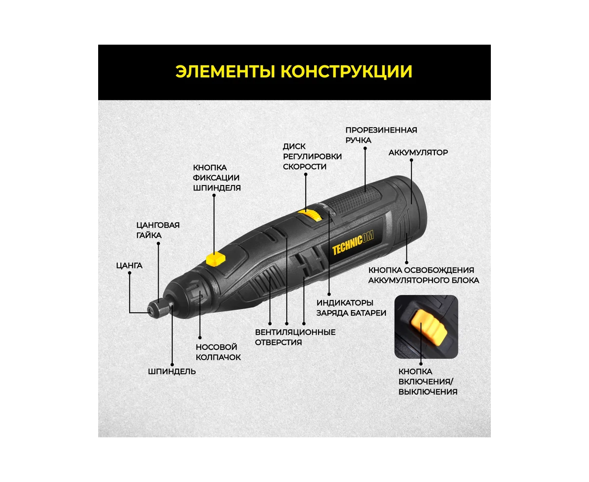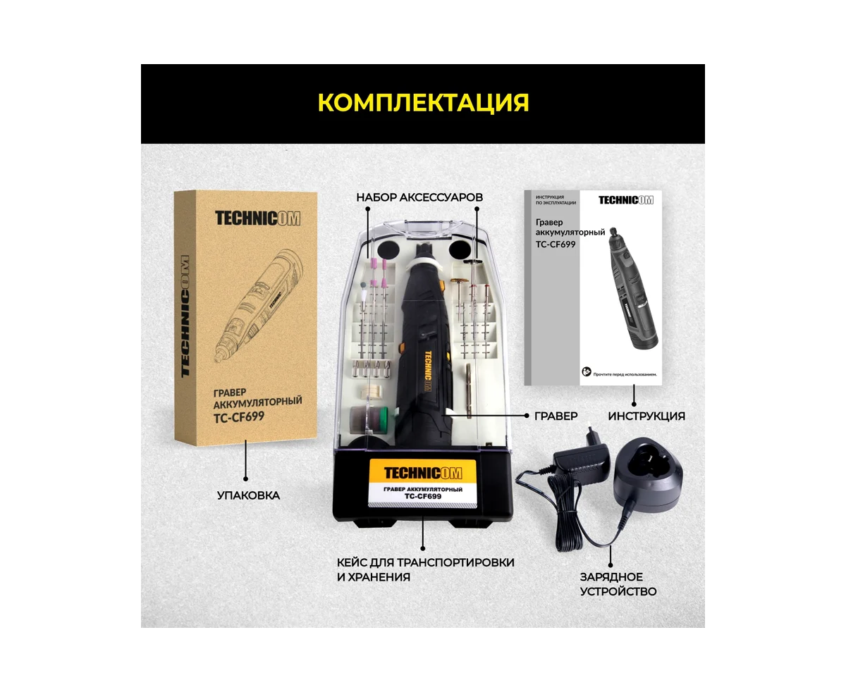 Гравер TECHNICOM TC-CF699 12В, 2Ач, 6 скоростей, 5000-25000 об/мин, ЗУ