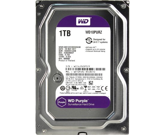 HDD 3.5" 1.0TB IntelliPower SATA3 64MB WD Purple (WD10PURZ) 24/7, для систем наблюдения (до 64 камер), AllFrame 4K уменьшает потери кадров