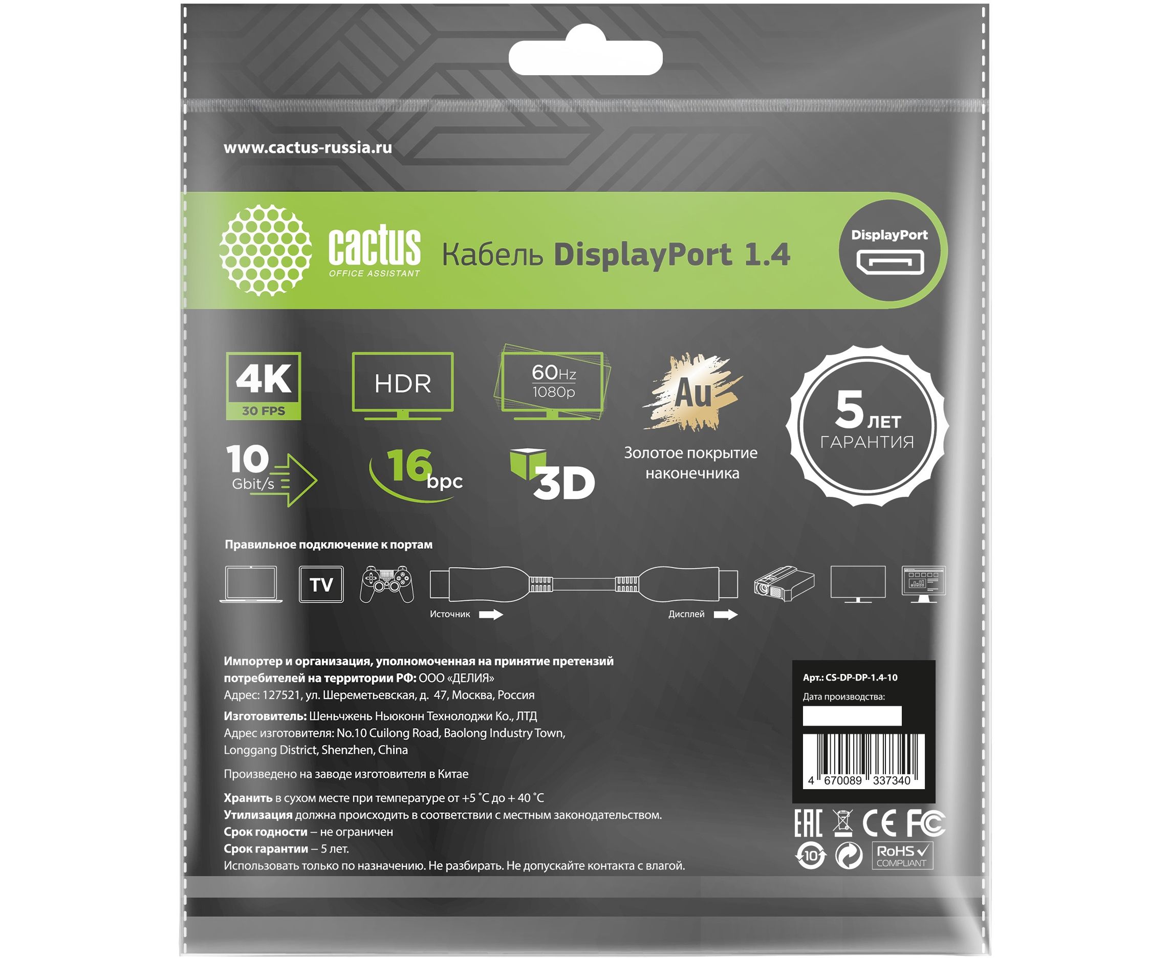 Кабель аудио-видео Cactus CS-DP-DP-1.4-10 DisplayPort(m)/DisplayPort(m) 10м позолоч.конт. черный