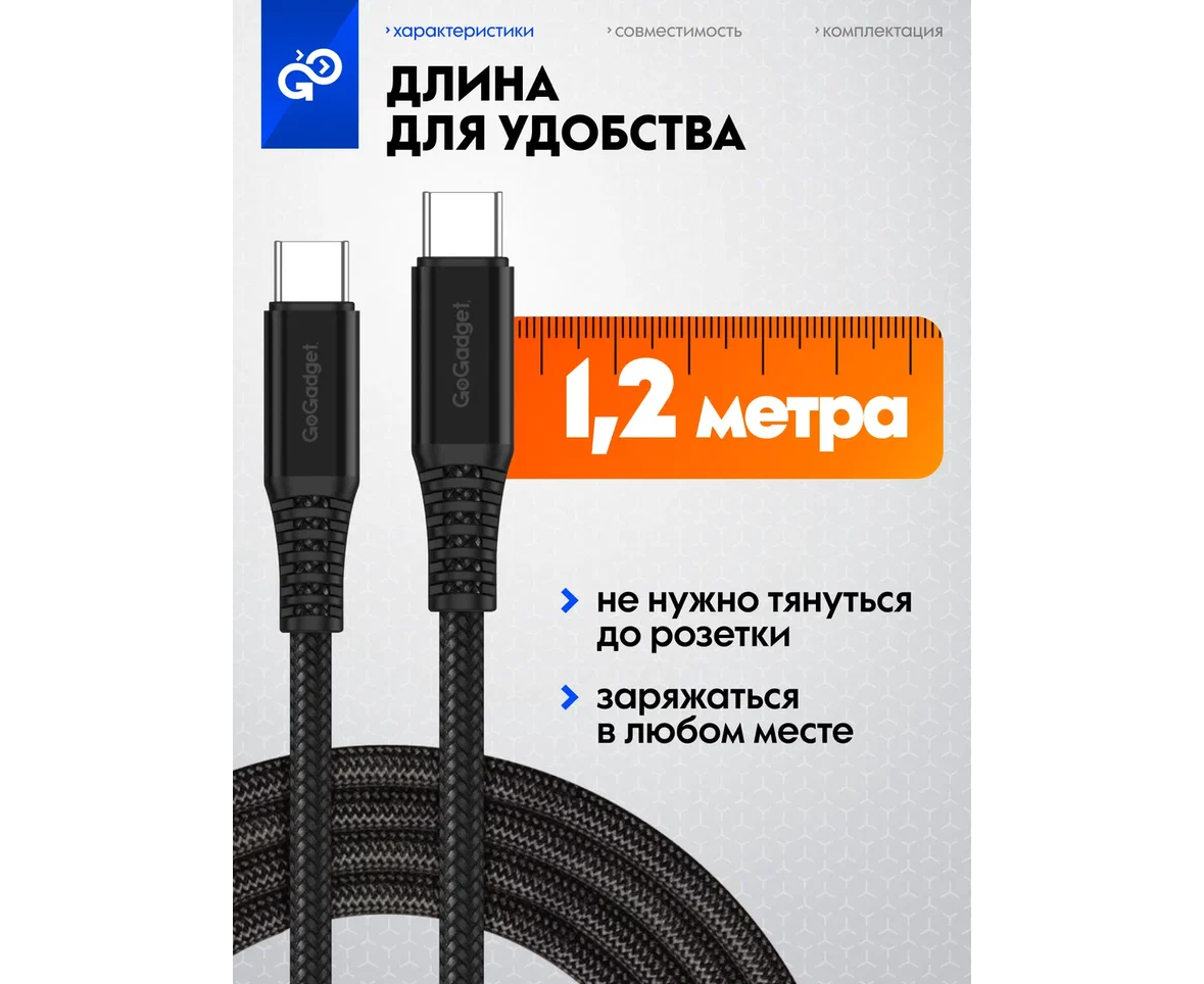 Кабель GoGadget USB-C/USB-С, до 60Вт, 3А, 1,2 м Нейлон, Черный