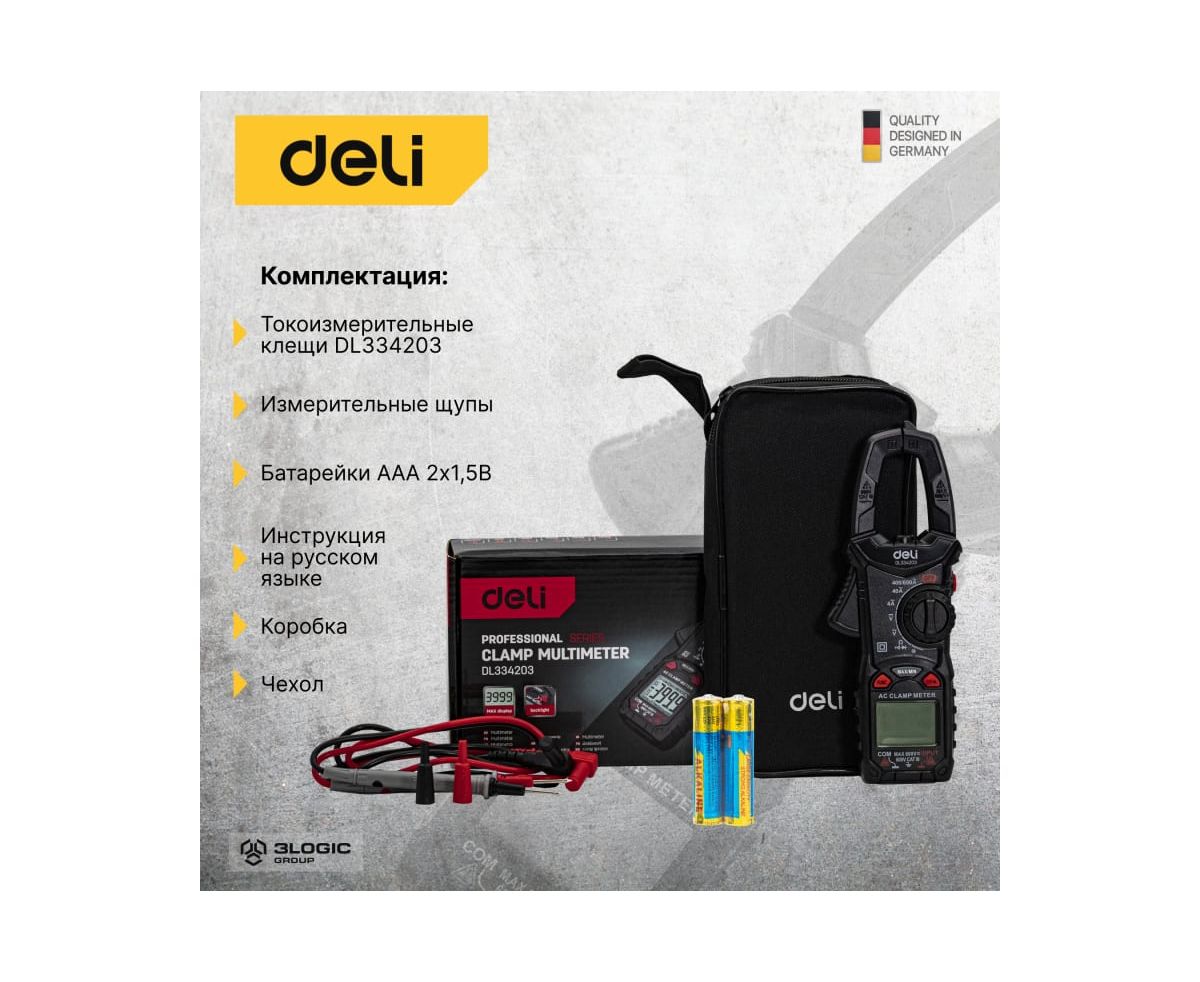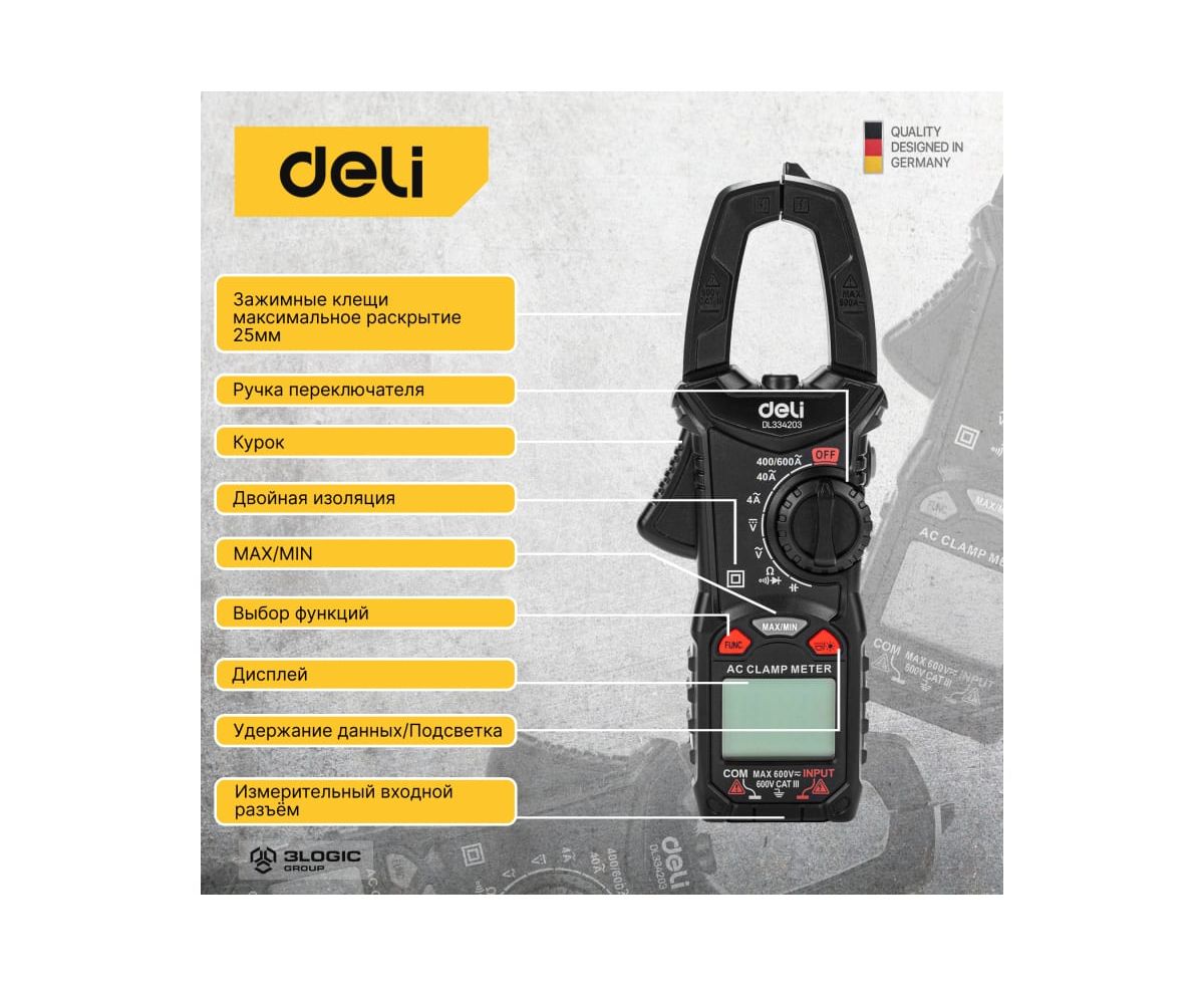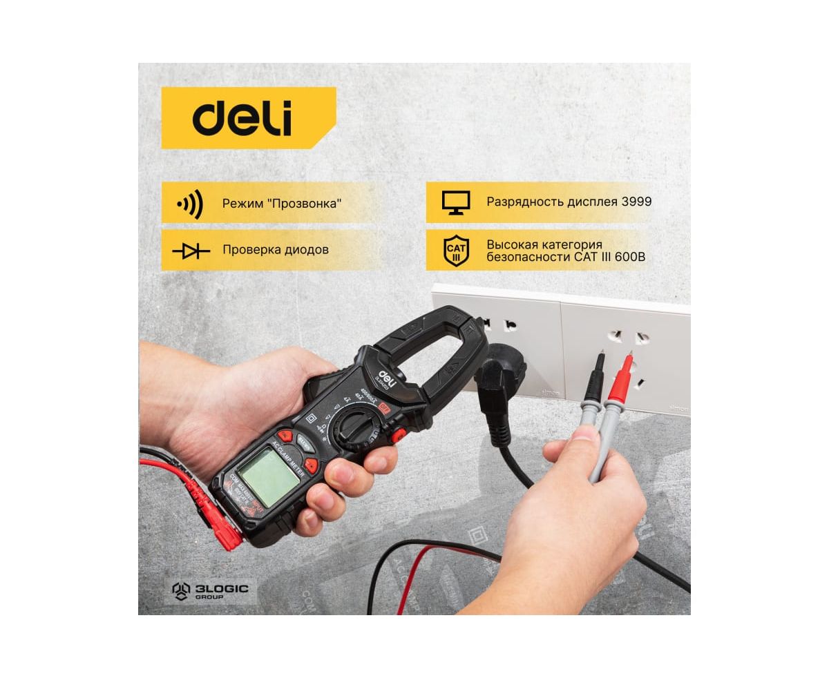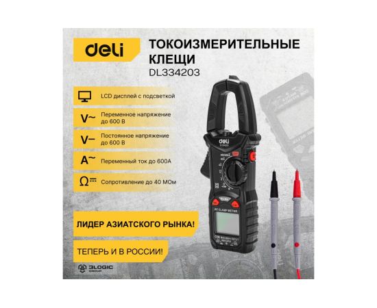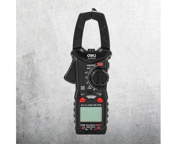 Токоизмерительные цифровые клещи DELI DL334203 102980 используются для измерения переменного тока, постоянного и переменного напряжения и сопротивления.