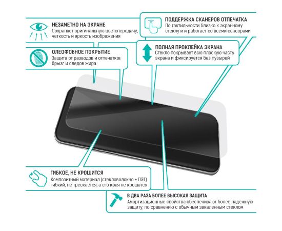 ГИБРИДНОЕ защитное стекло для Вашего смартфона сохраняет гибкость защитной пленки, и прочность стекла. Оно намного удобнее обычного закаленного стекла - как при транспортировке, так и при установке. Гибридное стекло тоньше, прочнее и надежно защищает смартфон от повреждений. Имеет отступы по 1 мм от края дисплея для удобства ношения защитного чехла. Оно имеет высокую степень устойчивости к царапинам, обеспечивает хорошую чувствительность к касанию и не влияет на сенсорный отклик по всей поверхности дисплея. Идеально прозрачное, не снижает четкость и яркость изображения, не меняет оригинальную цветопередачу. Изготовлено из гибкого композиционного материала (стекловолокно и ПЭТ). Верхний слой из стекловолокна по тактильным ощущениям близок к стеклу и не влияет на работу сенсора по всей поверхности экрана. Гибридное стекло гибкое, оно не растрескивается и не крошится, как обычное закаленное стекло. Защищает от пыли, грязи, брызг и царапин. Полная проклейка поверхности (Full Glue). Специальная смесь высококачественных клеев гарантирует установку без пузырьков воздуха и что стекло не отслоится с течением времени. Внимание! Гибридное стекло поставляется в двух защитных транспортировочных пленках (на тыльной и лицевой стороне). Данные пленки могут быть поцарапаны. После наклеивания стекла снимите защитную синюю пленку "2" с лицевой стороны!