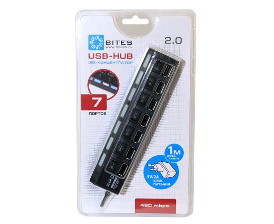 Производитель: 5bites Версия USB: 2.0 480MBPS Внешние порты: 7*USB2.0 Дополнительное питание: внешний блок питания 5В-2А (в комплекте) Длина шнура блока питания (м): 1 Материал корпуса: пластик Особенности: индивидуальные переключатели питания с индикацией для каждого USB-порта, встроенный USB-кабель Цвет: черный Системные требования: Windows XP/Vista/7/8/10, Mac OS 10.2, Linux Комплектация: блок питания