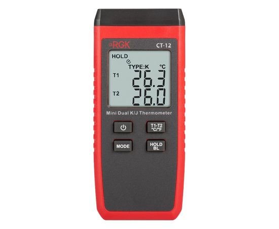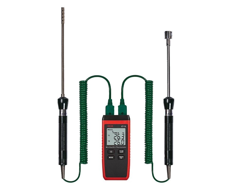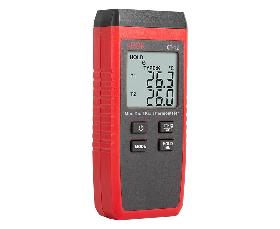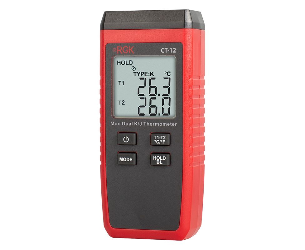 Термометр RGK CT-12 способен измерять температуру от - 40 до + 500 °C, если используется зонд TR-10S из комплекта. Модель оснащена 2 гнездами для подключения выносных датчиков, которые оснащены функцией определения разности между каналами. Комплект зондов позволяет измерять прибором как жидкости, так и газообразные вещества.