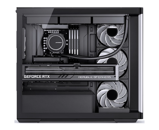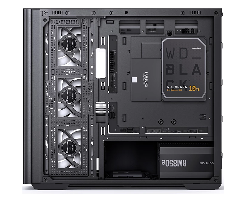 2 x 140 мм на верхней панели, 3 x 120 мм на боковой панели, 140 мм на задней панели, 120 мм на нижней панели, 140 мм для охлаждения блока питания