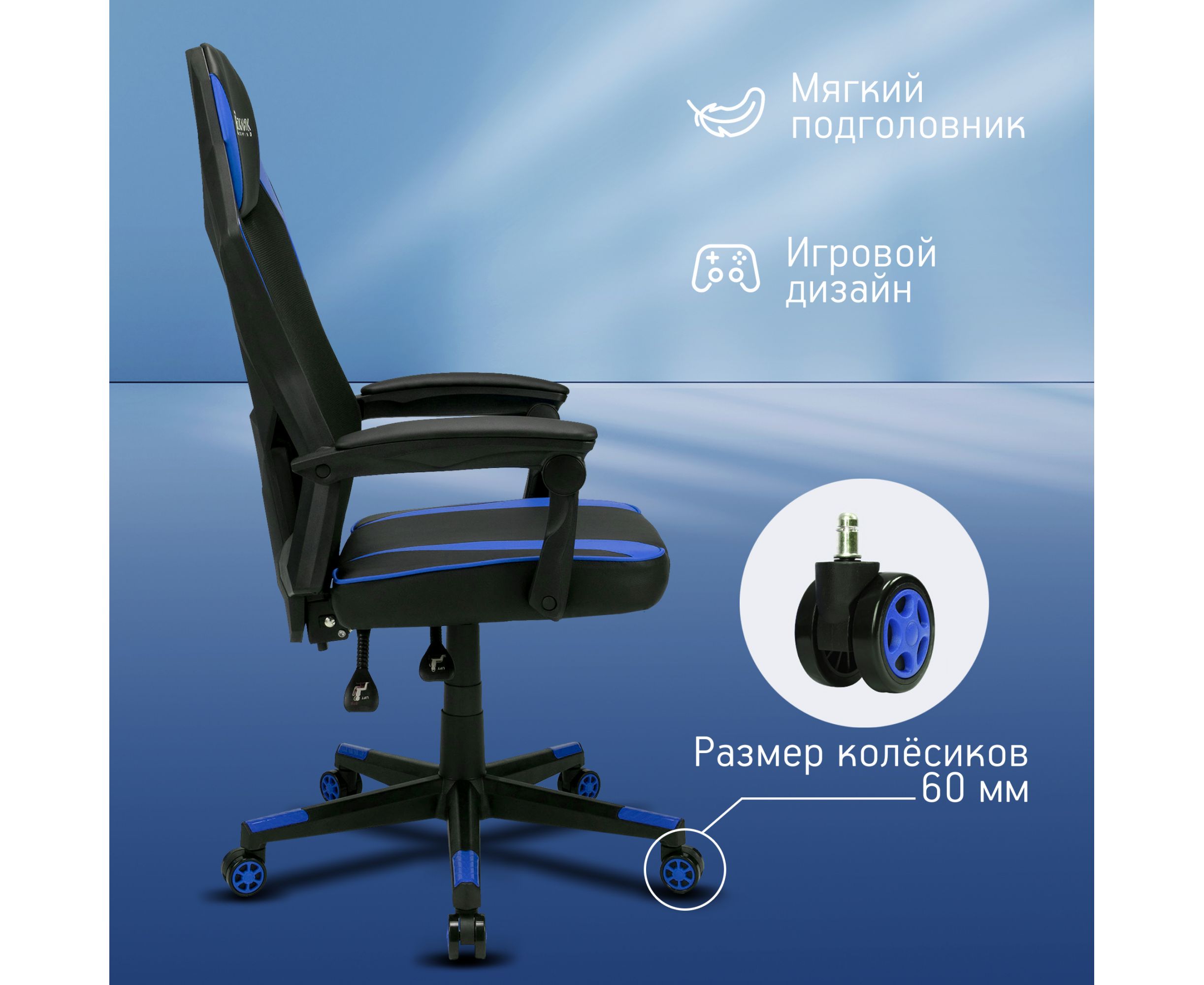 Модель 121G обладает стильным геймерским дизайном. Вставки синего цвета на подголовнике, спинке, сидении и крестовине сделают кресло эффектным элементом в любом интерьере. За счет удобной посадки модель подойдет и для ежедневной работы за ПК.