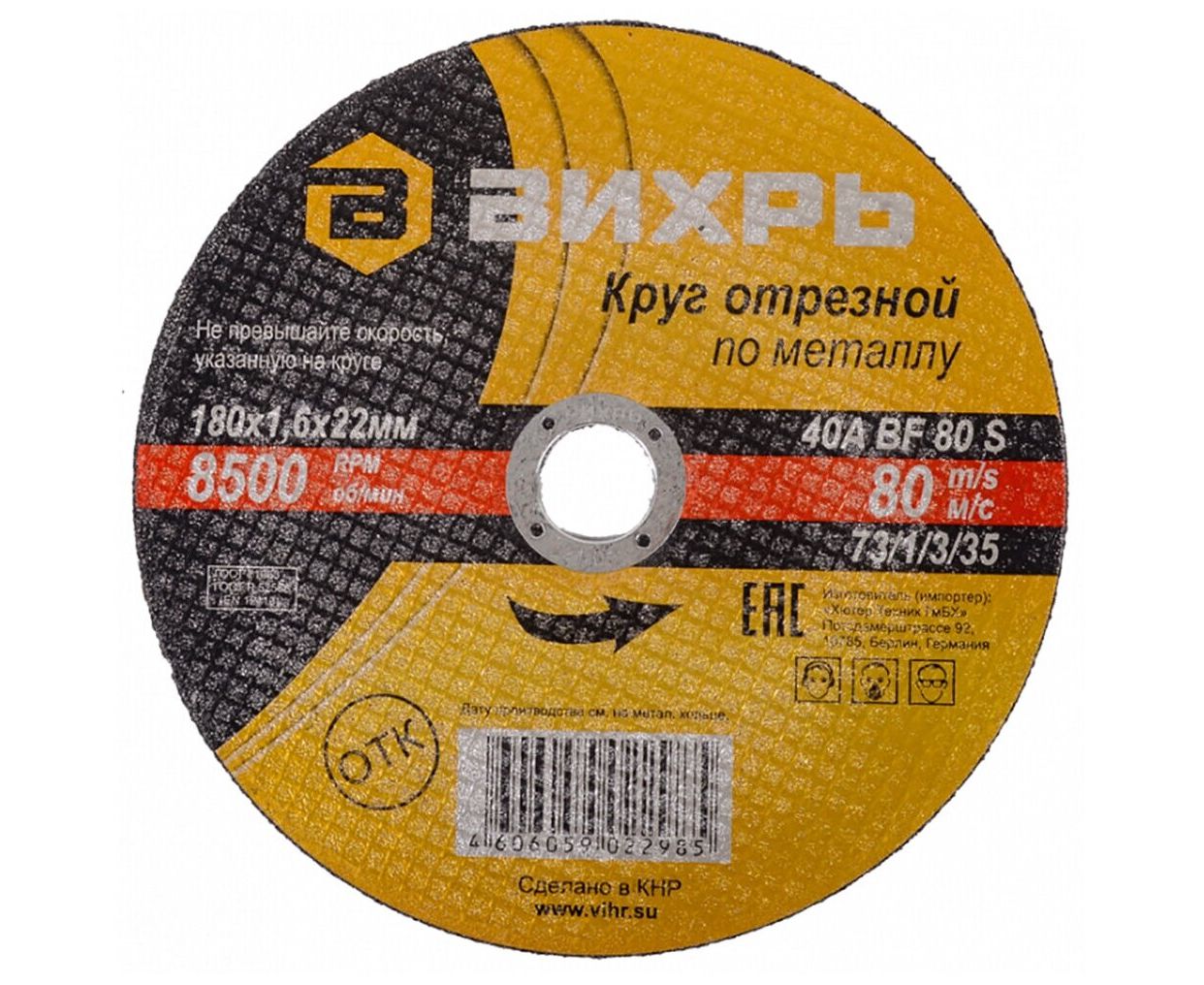 Круг отрезной по металлу Вихрь 180х1,6х22 мм 73/1/3/35