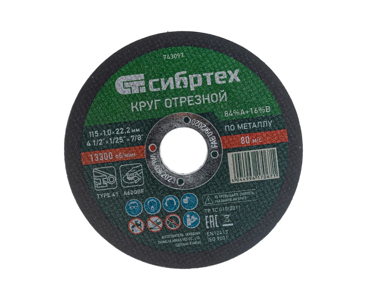 Круг отрезной Сибртех 743097 по металлу, 115х1,0х22,2 мм, 84%A+16%B