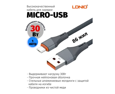 LDNIO LS631/ USB кабель Micro/ 1m/ 30W/ медь: 86 жил/ Нейлоновая оплетка/ Gray
