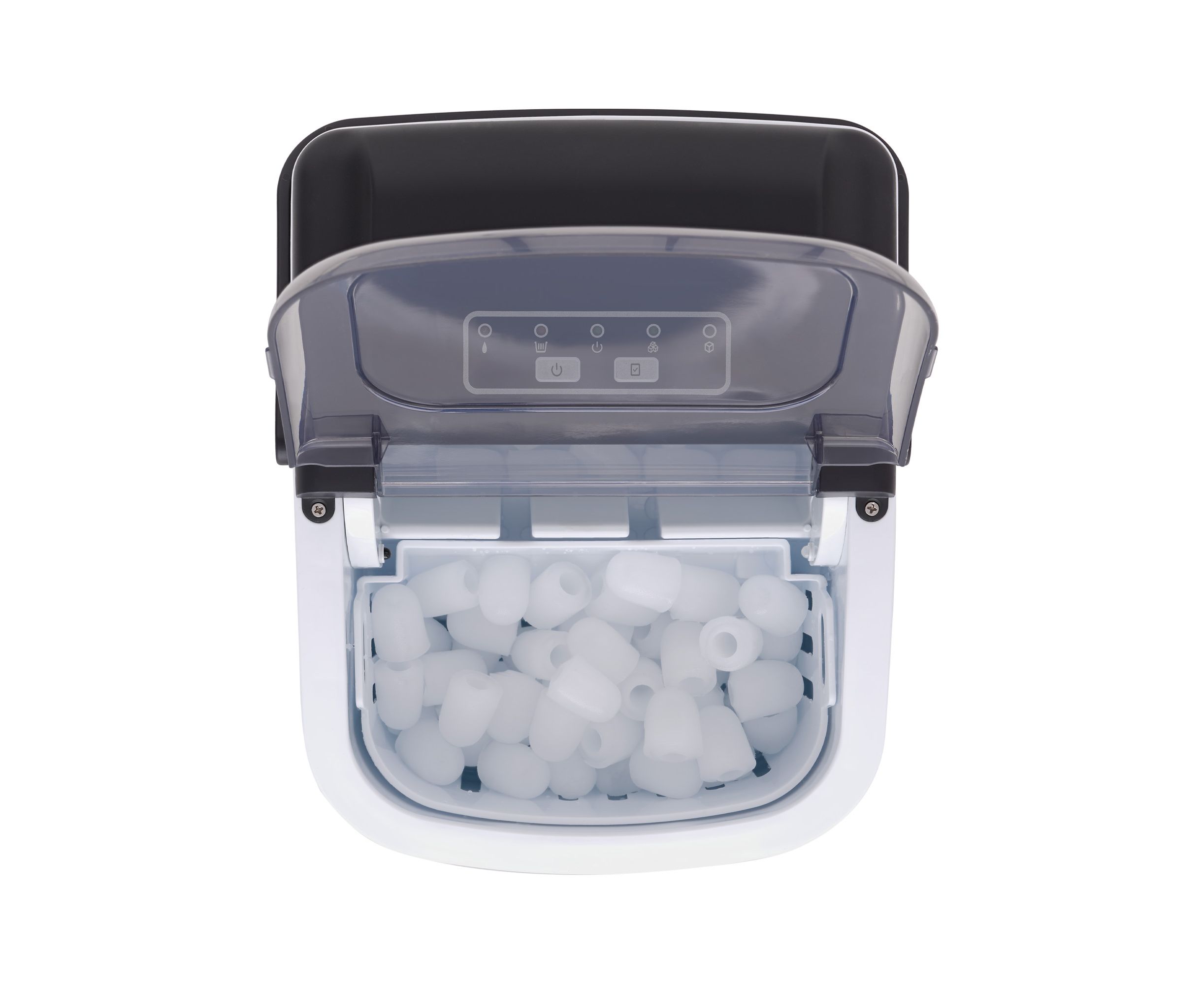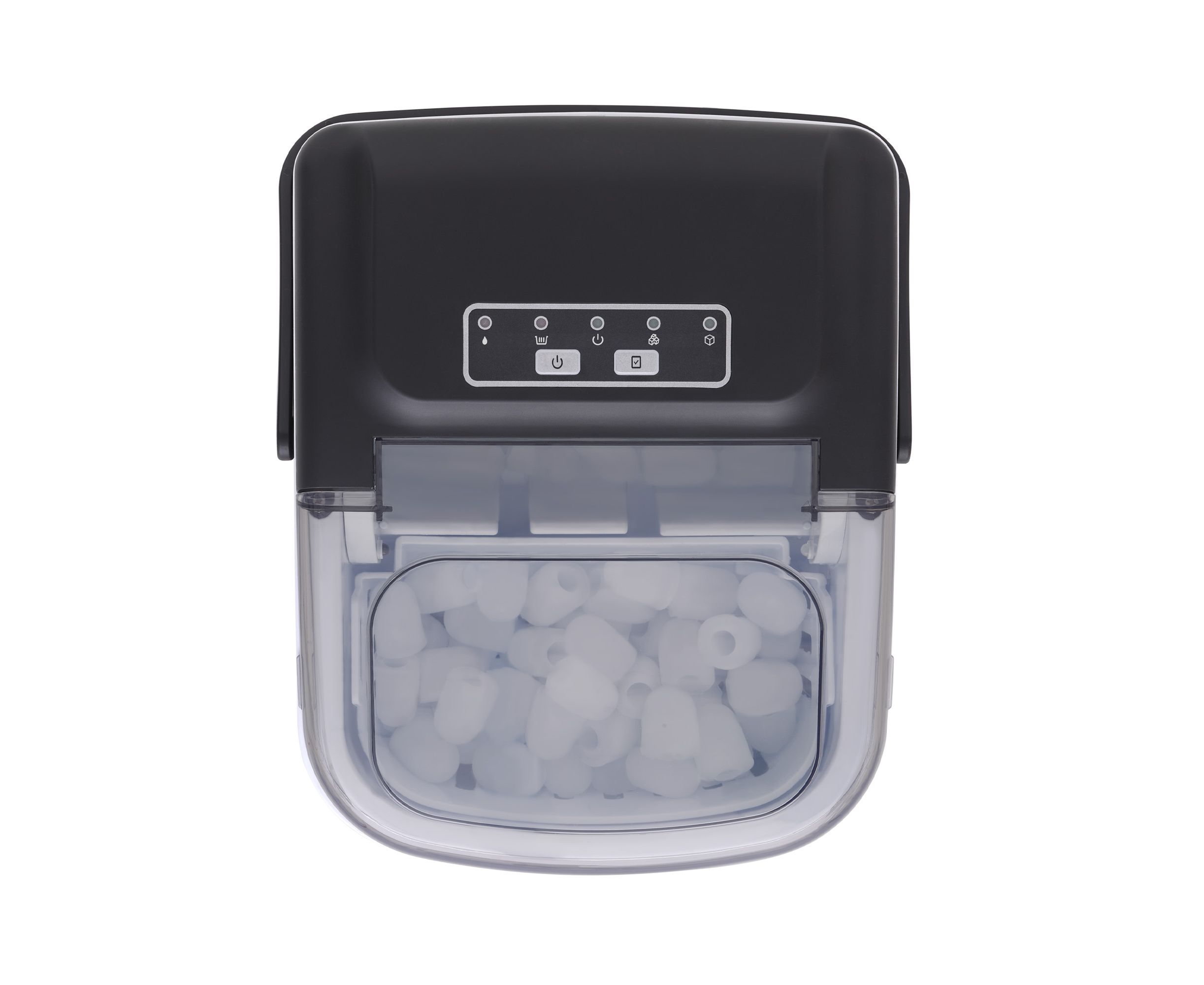 Пользоваться прибором легко: на панели управления расположены кнопки, а также индикаторы выбранного размера льда, питания и заполнения корзины.