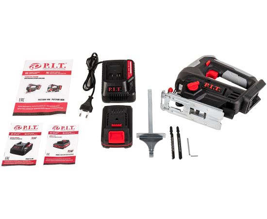 аккумулятор, зарядное устройство, полотно по дереву, полотно по металлу, параллельный упор, шестигранный ключ, пластиковый кейс