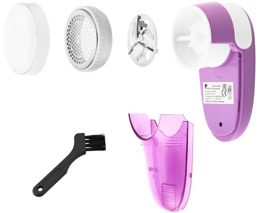 Особенности: Для хранения прибора предусмотрена крышка. Контейнер для сбора катышков также съёмный и легко чистится. В комплекте с прибором идёт щёточка для чистки ножей.